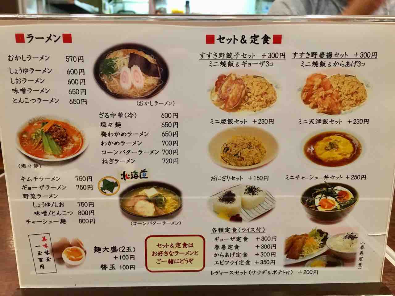 メニューは、ラーメンを中心に、セットや定食もあります。ラーメンの種類豊富で迷います。