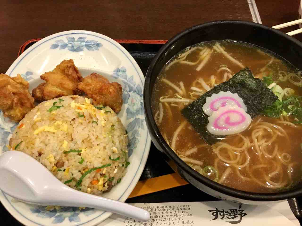 迷いましたが、一番シンプルな「むかしラーメン」(570円)+「すすき野唐揚げセット」(300円)をいただきました。