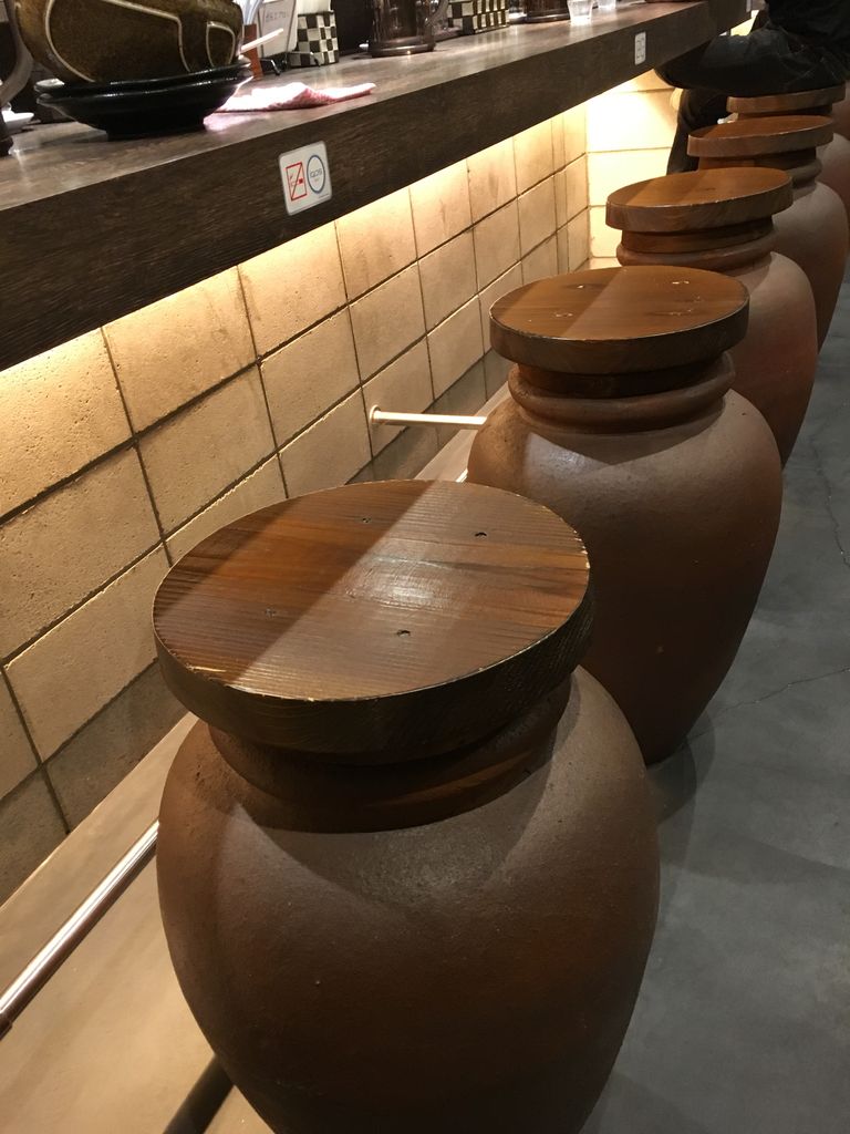 もう一つ特徴的なのが、カウンター席の座る椅子。なんとハイチェアの高さのある壺なんです。座面の下には何か入っているのかと開けてみようとしましたが、動きませんでした。この椅子、大変インパクトがあって外からみるとオシャレなバーにも見えなくないのですが、でも「中華そば」というところが面白い。
