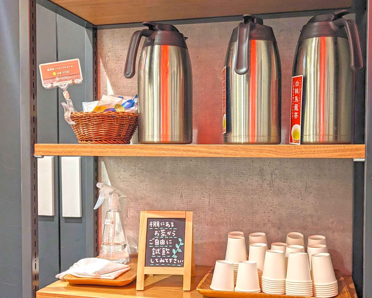冷たいお水と暖かいジャスミン茶、白桃烏龍茶はセルフサービスで紙コップ共に設置されています。暖かい白桃烏龍茶はとても良い匂いで癒されました。店内の書籍を読みながらしばらくゆっくりと休憩をしたくなります。