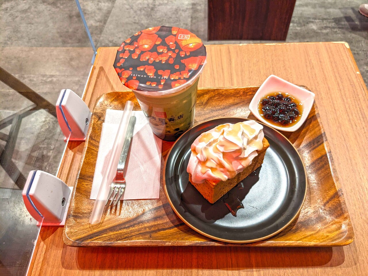 黒糖抹茶豆花豆乳と台湾カステラを注文、座席に座って待っていると出来上がり後に運んで来られました。抹茶と豆乳の相性がよく豆乳は底の方にいっぱい沈んでいました。台湾カステラには生クリームが付いており美味しかったです。ボリュームがあり直ぐにお腹いっぱいにまたタピオカをかけると違った食感が楽しめました。