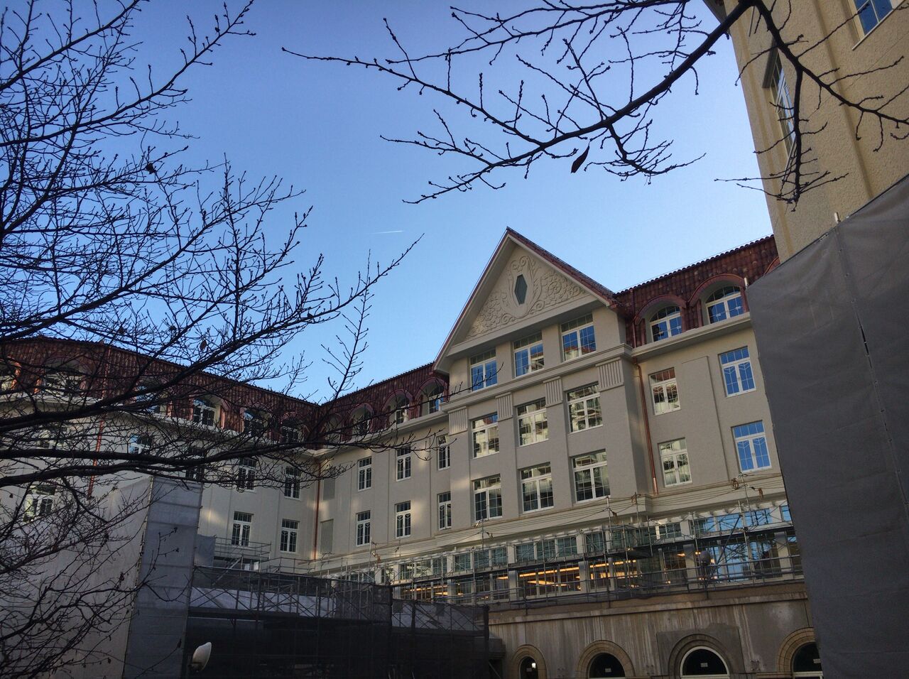 外観はほぼ出来上がりつつある。現在のホテルのデザインを踏襲しつつ、宝塚大劇場、花のみちの建物と同化するような景観が出来上がっている。