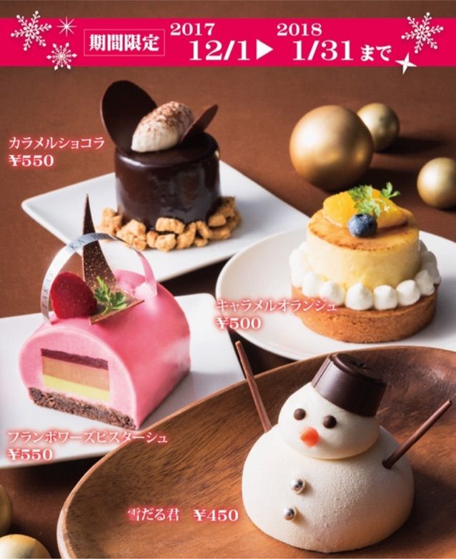 他にも1月31日までの冬限定スイーツも4種販売されています。フランボワーズ、ピスタチオ、オレンジなどカラフルで大人も楽しめそうな4種。クリスマス限定ケーキと組み合わせるのもよさそうです。