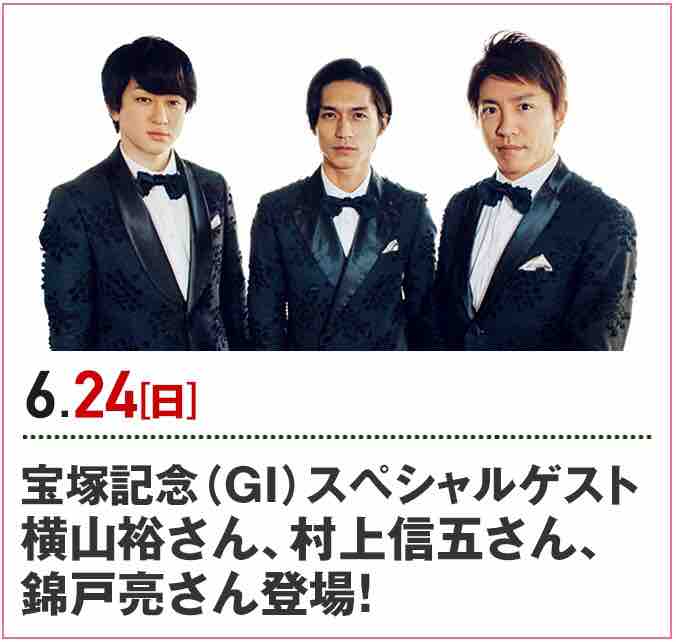 宝塚記念のテレビコマーシャルでも登場した関ジャニ∞の横山さん、村上さん、錦戸さんが登場。国歌斉唱などを行う。