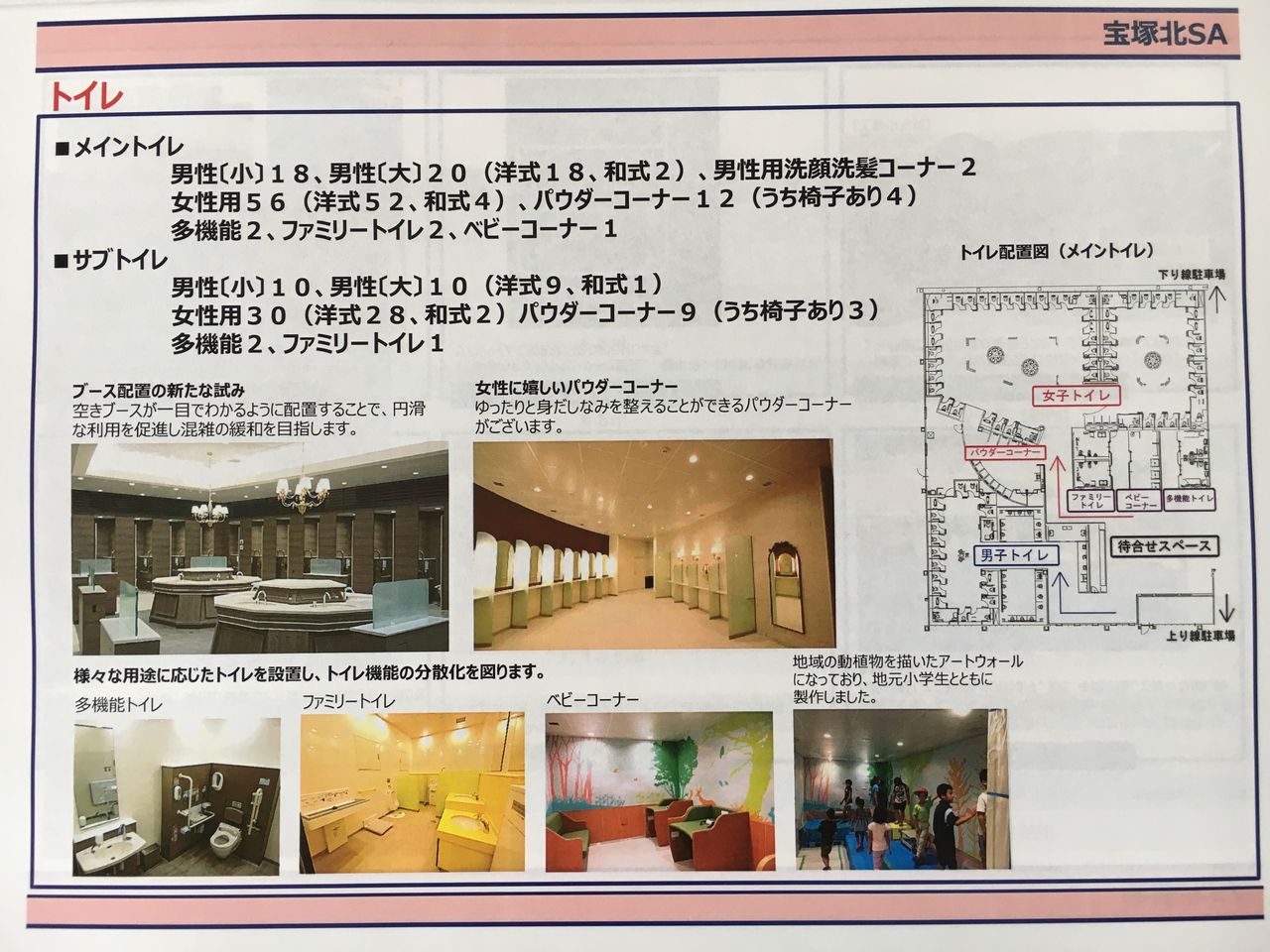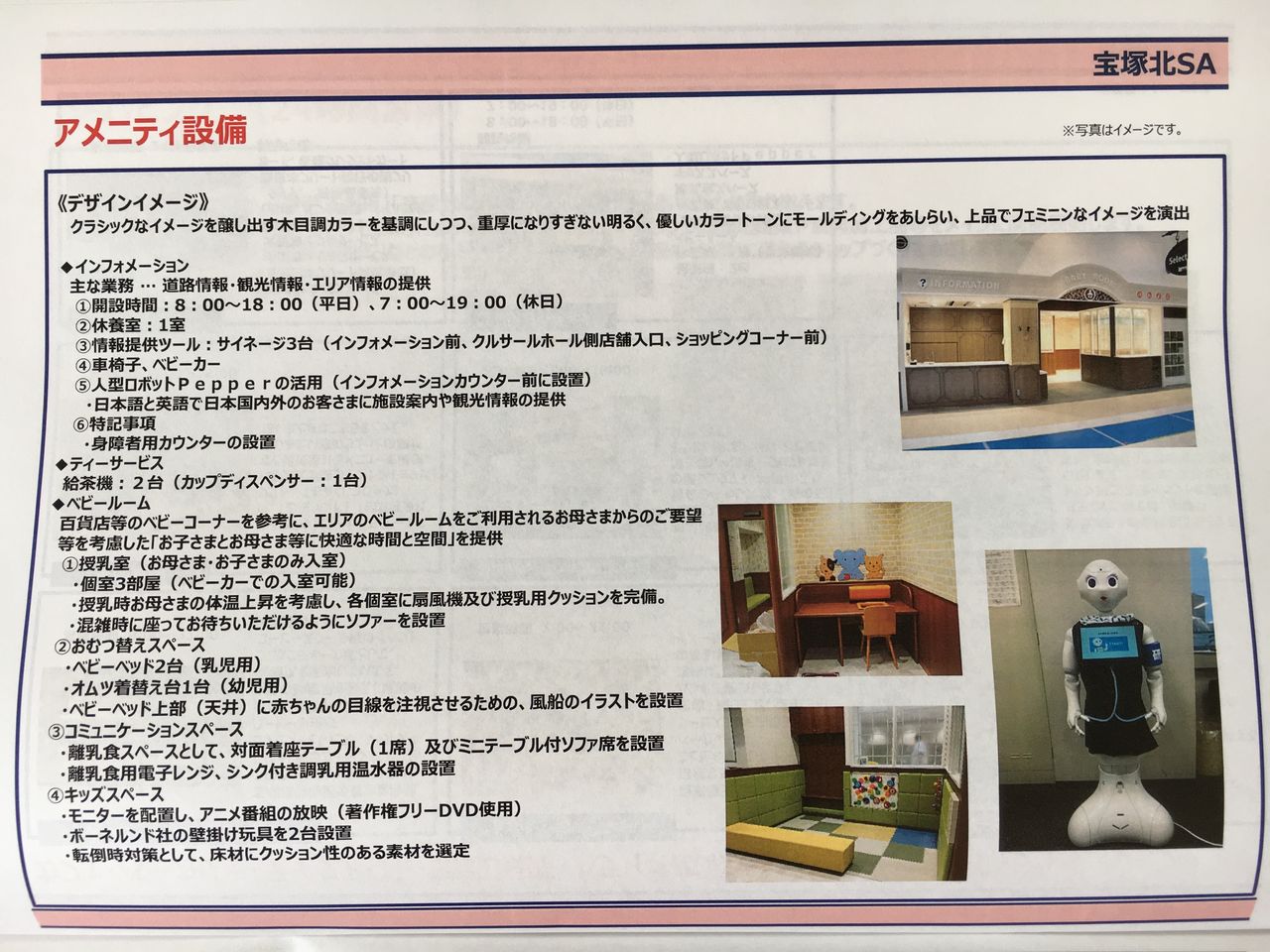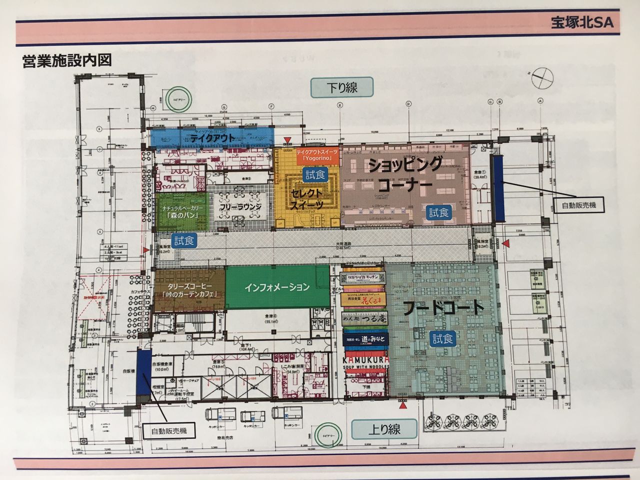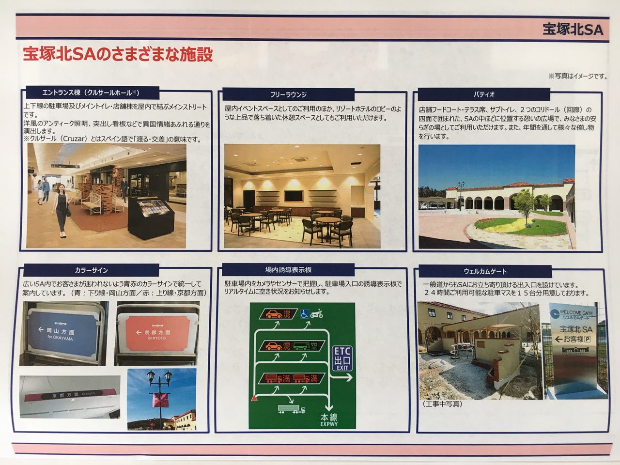 宝塚北SAはオフシャルサイトの記事によると、施設は、“宝塚市中心部「花のみち」周辺の南欧風景観をイメージした「宝塚モダン」をコンセプトにした建物外観と、上下線どちらのお客様も同じ施設をご利用になれる上下線集約型のレイアウトが特徴です。” とある。さらにこの宝塚北SAは、なんと高速道路を利用しないお客様もSAへ入る事が出来るので、ショッピングやフードコードでの食事、イベント参加が出来る事になる。