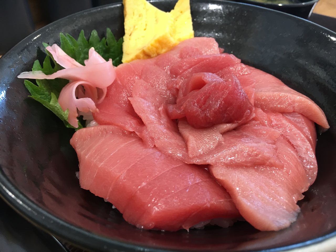 醤油は丼と相性抜群の出汁醤油をかけてたべる。さすがにこれだけの値段だけあってまぐろはトロトロ。酢飯もツンとし過ぎないまろやかで、なかなかの好み。そしてダークホースなのは、添えてある玉子と揚げてある大葉が個人的には存在感高まる感じだ。