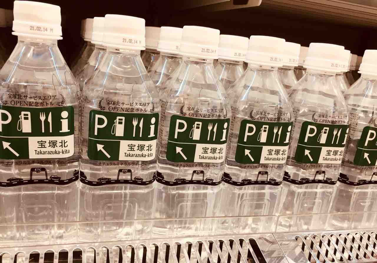 SA内のメイン施設になる店舗棟にあるショッピングコーナーにならぶOPEN記念のナチュラルミネラルウォーター、こちら在庫ロットで販売終了とのこと。
