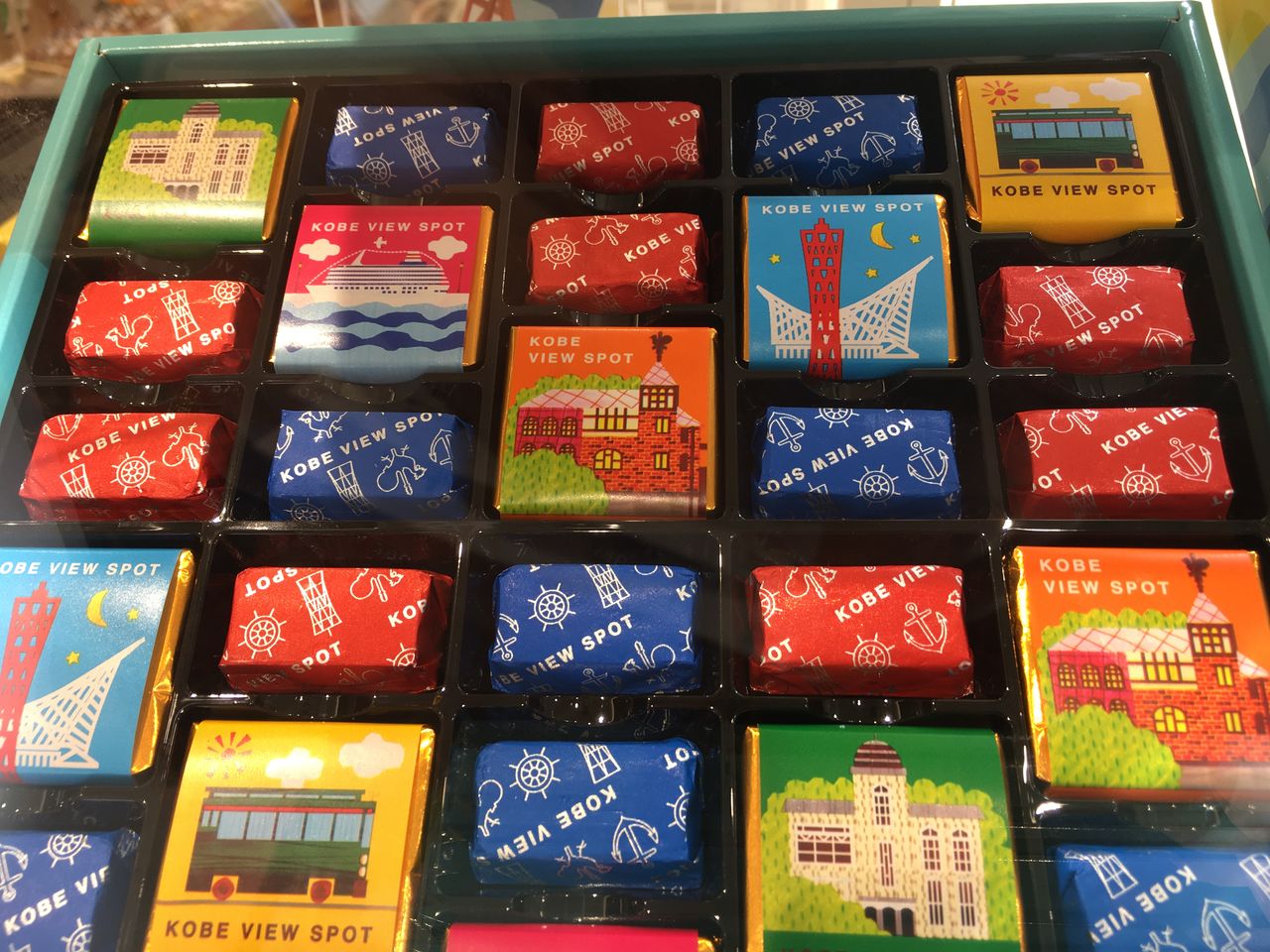 こちらは、神戸ビュースポットチョコレート。ひとつひとつのラッピングデザインが神戸らしい。