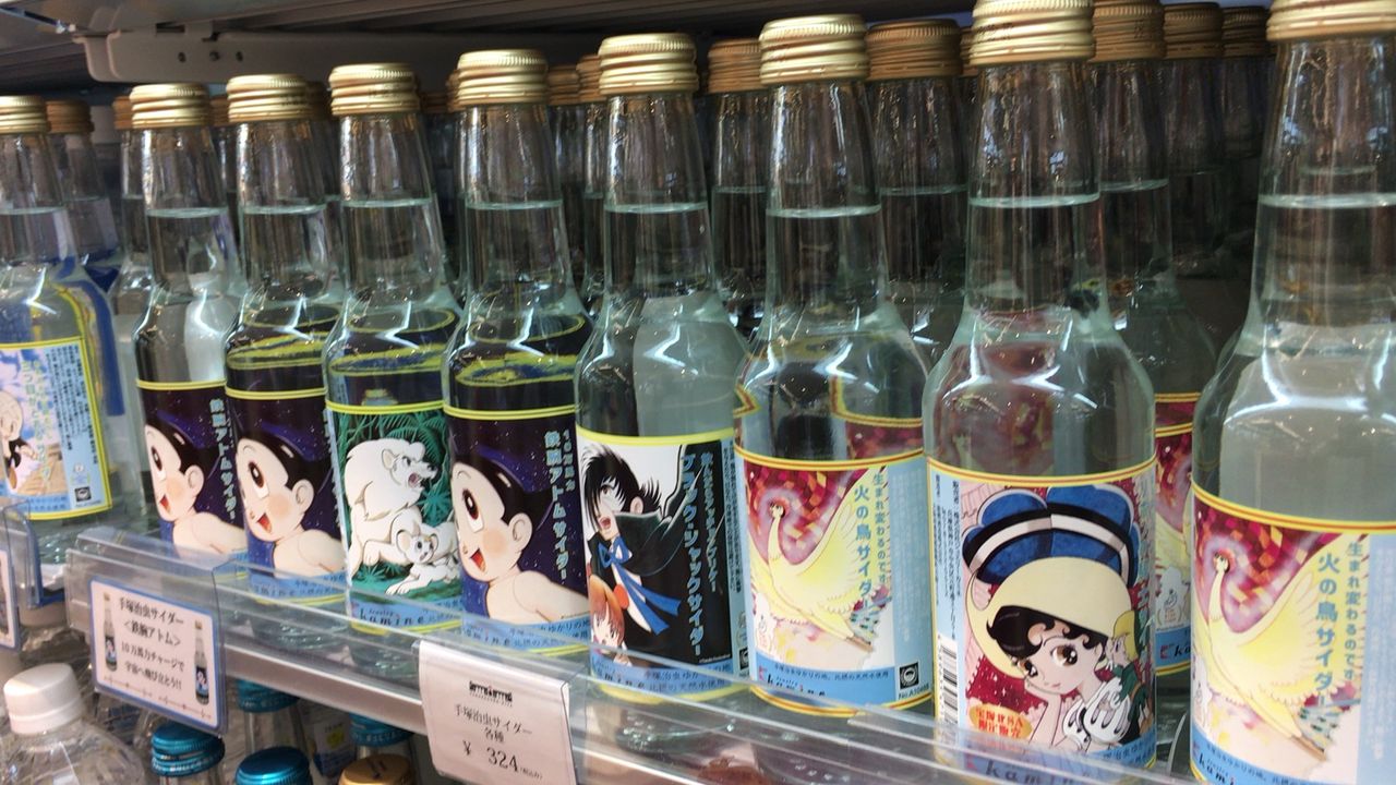 ここ宝塚サービスエリア限定を含む、瓶モノの地域限定品もズラリと並ぶインパクトは他のサービスエリアでは類を見ない。こちらは手塚治虫シリーズのサイダー。