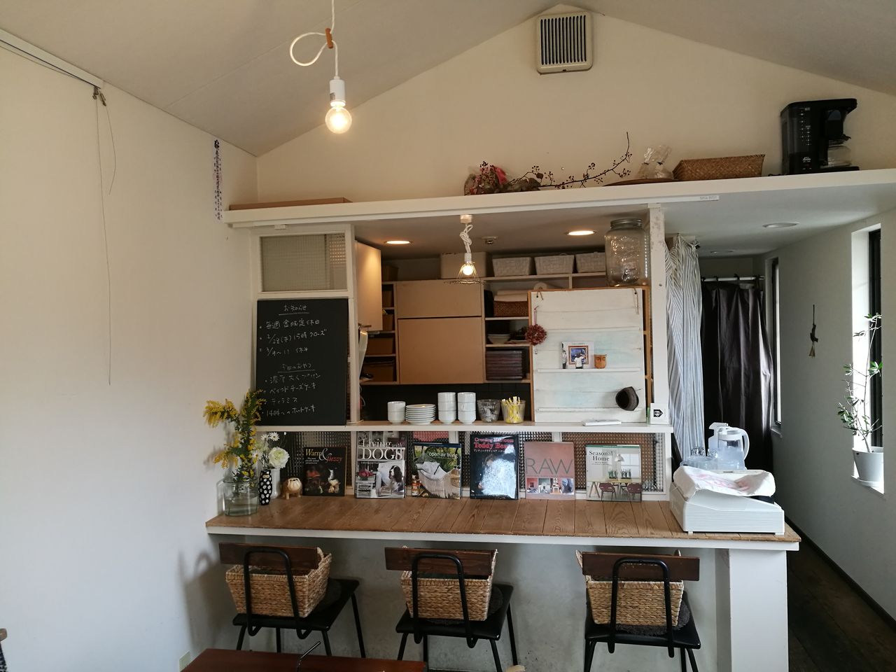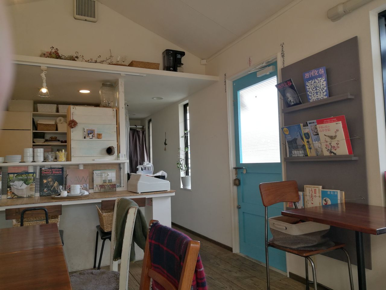 お店の中もとても素敵です。白い壁と床の木目、茶色のテーブルと椅子。寒い日に嬉しいひざ掛けのカラーもコーディネートされているんですね。さりげなく飾られた植物や小物、書籍もオーナーのセンスが光っていて、居心地がいい空間です。