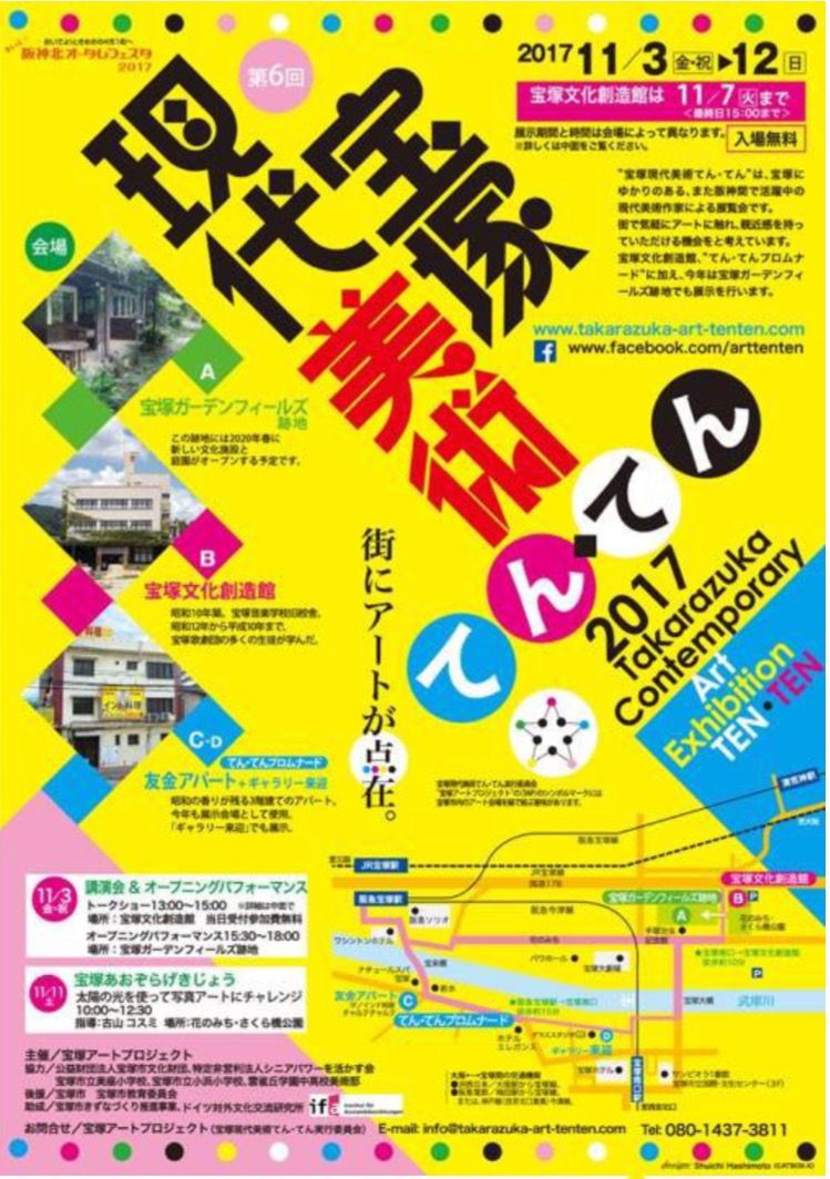 2017年11月3日(金・祝)~12日(日)「第6回宝塚現代美術てん・てん2017」(入場無料)が開催される。展示会場は、JR・阪急宝塚駅、阪急宝塚南口駅、阪急清荒神駅を結ぶエリアにある宝塚文化創造館など4か所。本イベントは、2002年、宝塚南口駅前再開発ビルの空き店舗を活用した、「街へ飛び出す現代アート」がコンセプトの『宝塚現代美術展・店』からスタートした。宝塚にゆかりのある、または阪神間で活躍中の現代美術作家による展覧会。イベントを機に街で気軽にアートに触れ、親近感をもってもらいたいという想いで開催される。今年は、”宝塚文化創造館”、”てん・てんプロムナード”に加え、新たに”宝塚ガーデンフィルズ跡地”でも展示がみられる。11/3(金祝)には講演会&オープニングパフォーマンス、11/11(土)には宝塚あおぞらげきじょうにて写真アートなどのイベントも開催される。