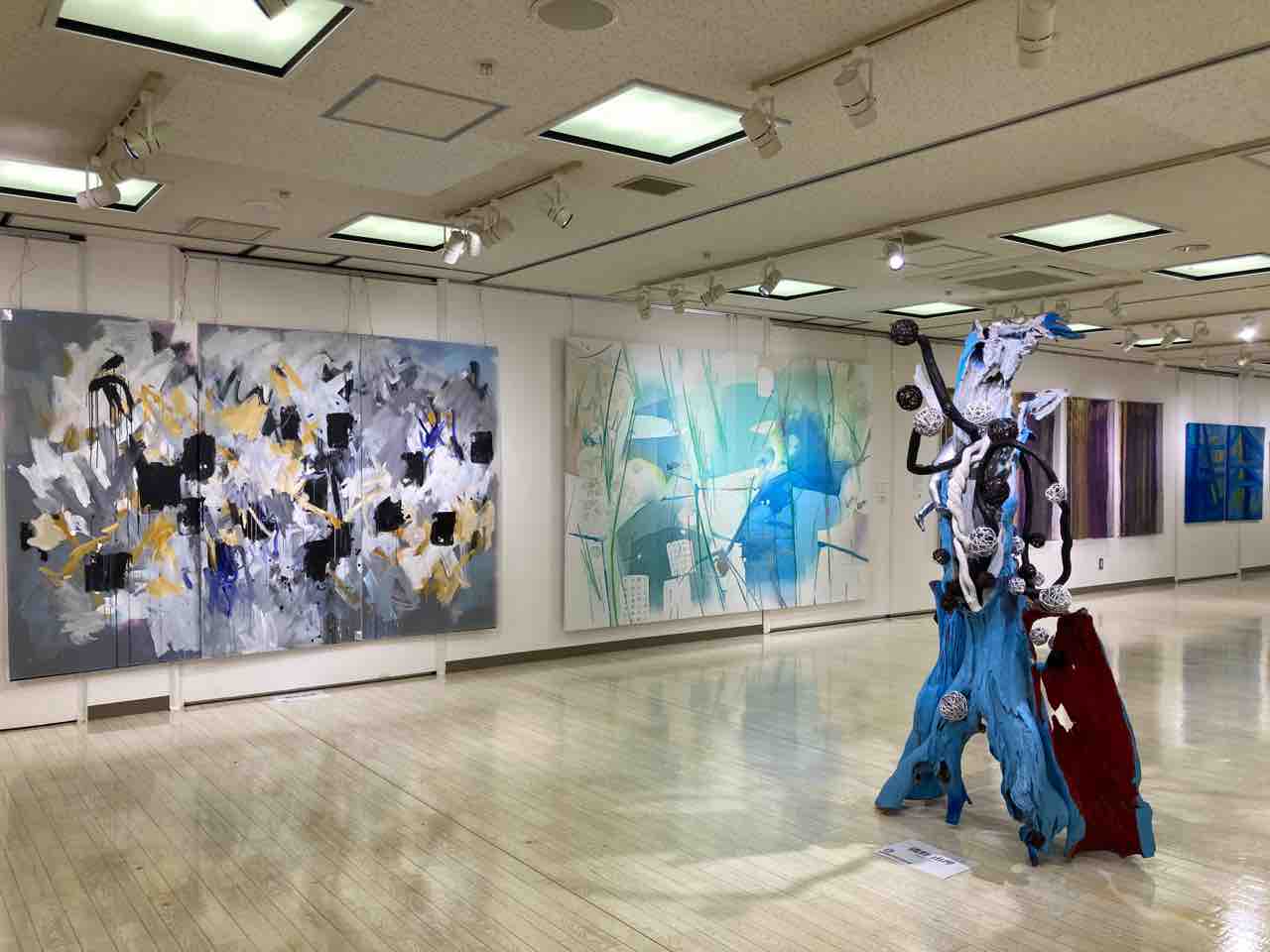 水面の変化を絵にした作品を描く奥村誠さん。今回は流れをテーマに描いたそうです。武庫川の絵(左)は、私たちの見慣れた風景だけに愛着を感じます。右は品川太地さんの作品。「現代社会は複雑で正解は一つではない。人類も多分野で多様性の時代に入り貧困と分断の異なる人間が存在する世界である。これからは個性を認め合い自由、平等、福祉が理念の地球号(新社会システム)が発進する」(作家による作品解説)。