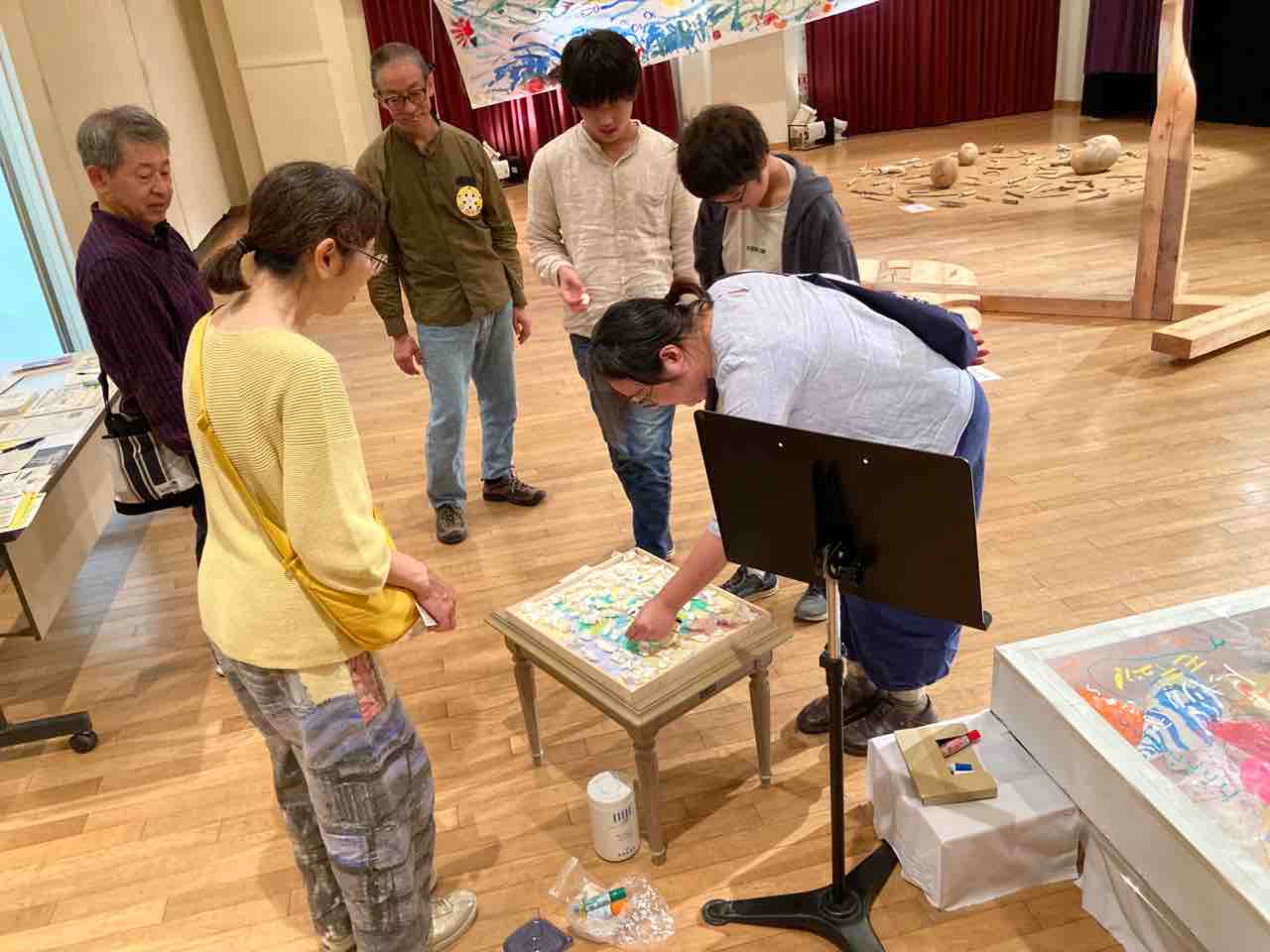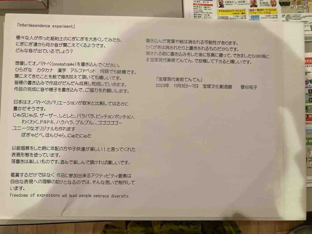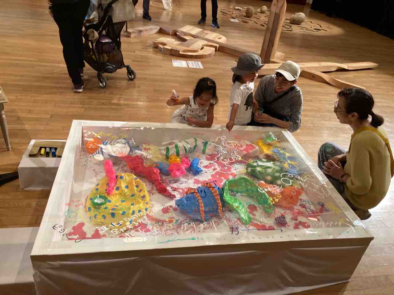 こちらは、菅谷知子さんの制作した作品が入った大きな箱の上に被せられた透明シートの上に、この作品を見て浮かんできたオノマトペを、来場者が好きな場所に好きな色マジックで書き込む来場者参加型作品。「何を書こうかな」と、大人も子どもも、ワクワクしながら自分の心に浮かんだオノマトペをキャッチしていました。「いつもの私だと絶対に浮かばないようなオノマトペが浮かんだ」と驚く参加者もいて、皆さん思わず笑顔になっていました。