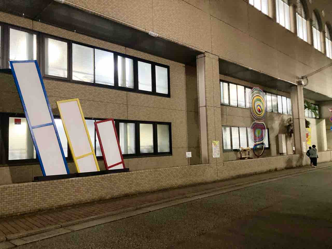 阪急宝塚駅近くの宝塚自転車駐車場の外壁にも現代美術の作品が飾られています。大塚卓さんの作品、「ななめの積み木」(手前)。街中にアートがあると、雨の日でも気分が上がりますね。