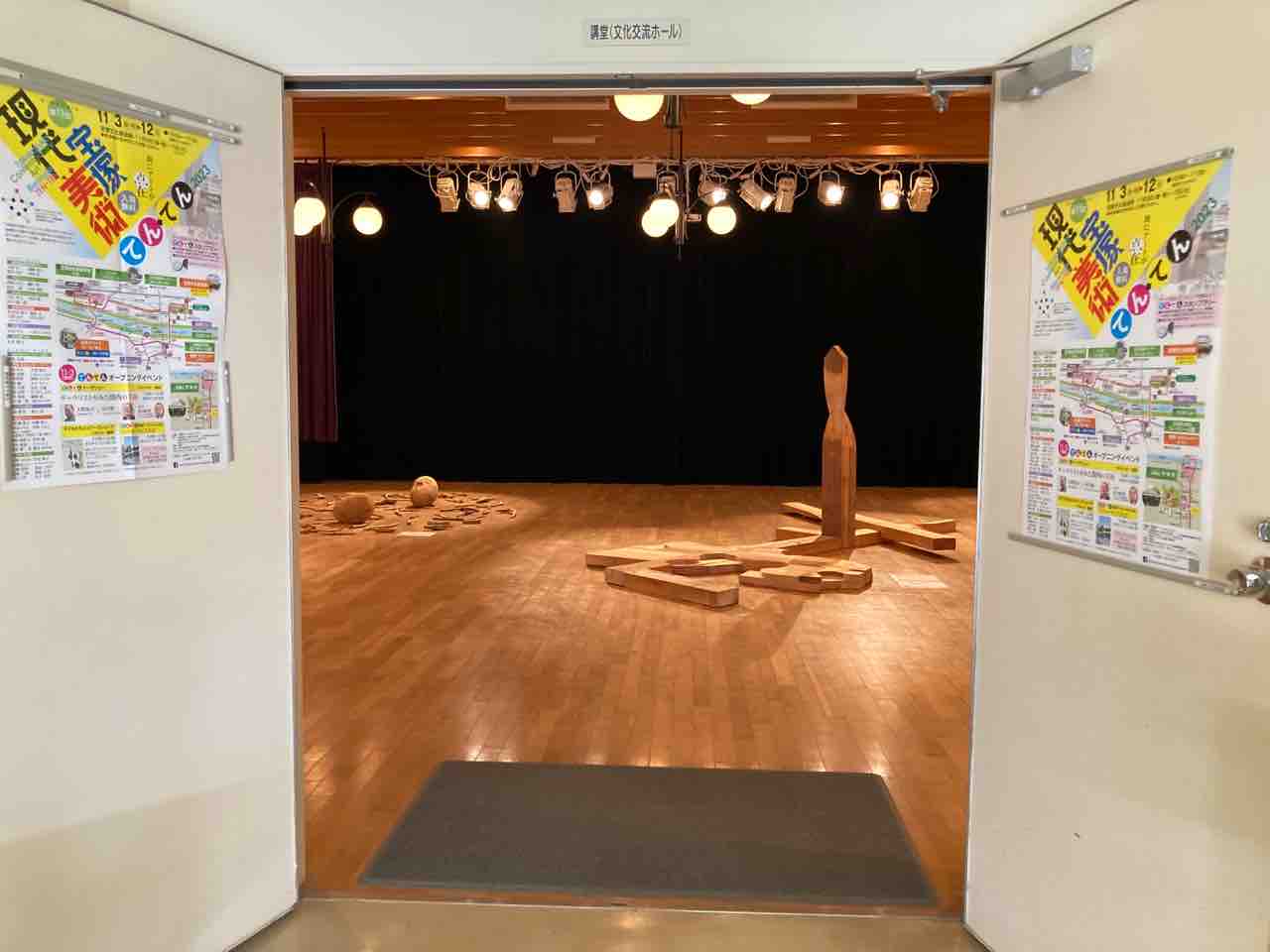 扉の向こうに見える彫刻は池田丈一さんの「ひねくれた形と記号デーS」。「1994年、大阪府とデュッセルドルフとのART-EX事業で滞在制作したアルファベットの作品を今回、展示します。自国の文化を大切にするドイツを知るにつけ、現在は日本文化を大切にしてひらがな造形をしている私がいます」(作家による作品解説)。