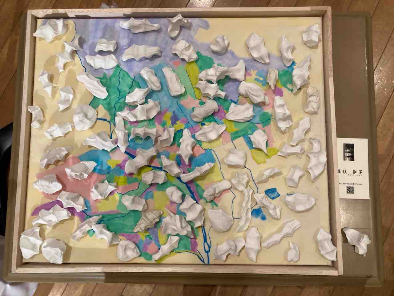 「遊びの時間は終わらない。にぎにぎ、ベタベタ、ゴシゴシ遊びながら作る」(作家による作品解説)。色分けした宝塚市の地図の好きな場所に、来場者が手で握ったユニークな形の紙粘土を置いていく、菅谷知子さんによる来場者参加型の作品。私は地図上の自宅がある場所近くに、自分で握った紙粘土を置きました。