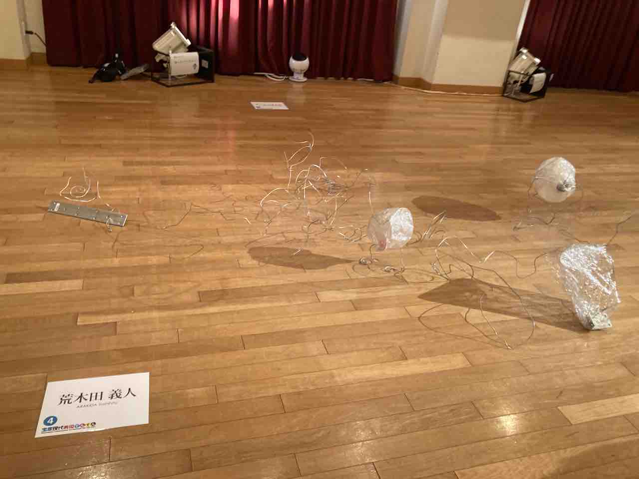 普段は理科の教員をしている荒木田義人さんの作品。「段ボール、発泡スチロール、サランラップ、日常的なものからヘンテコな形を、それを日常の場に置くことでできる周辺の空間の変化を」(作家による作品解説)。