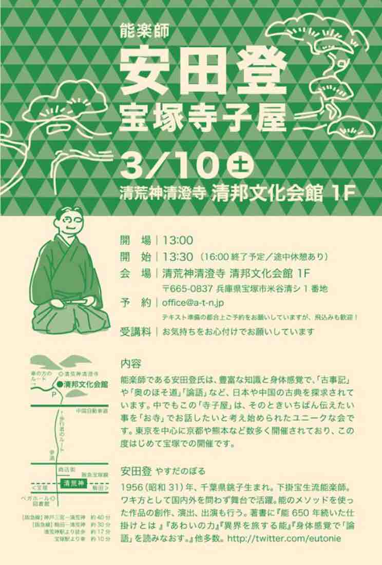 2018年3月10日(土)清邦文化会館(清荒神清澄寺駐車場前にあります)にて、「能楽師 安田登 宝塚寺子屋」が開催されます。