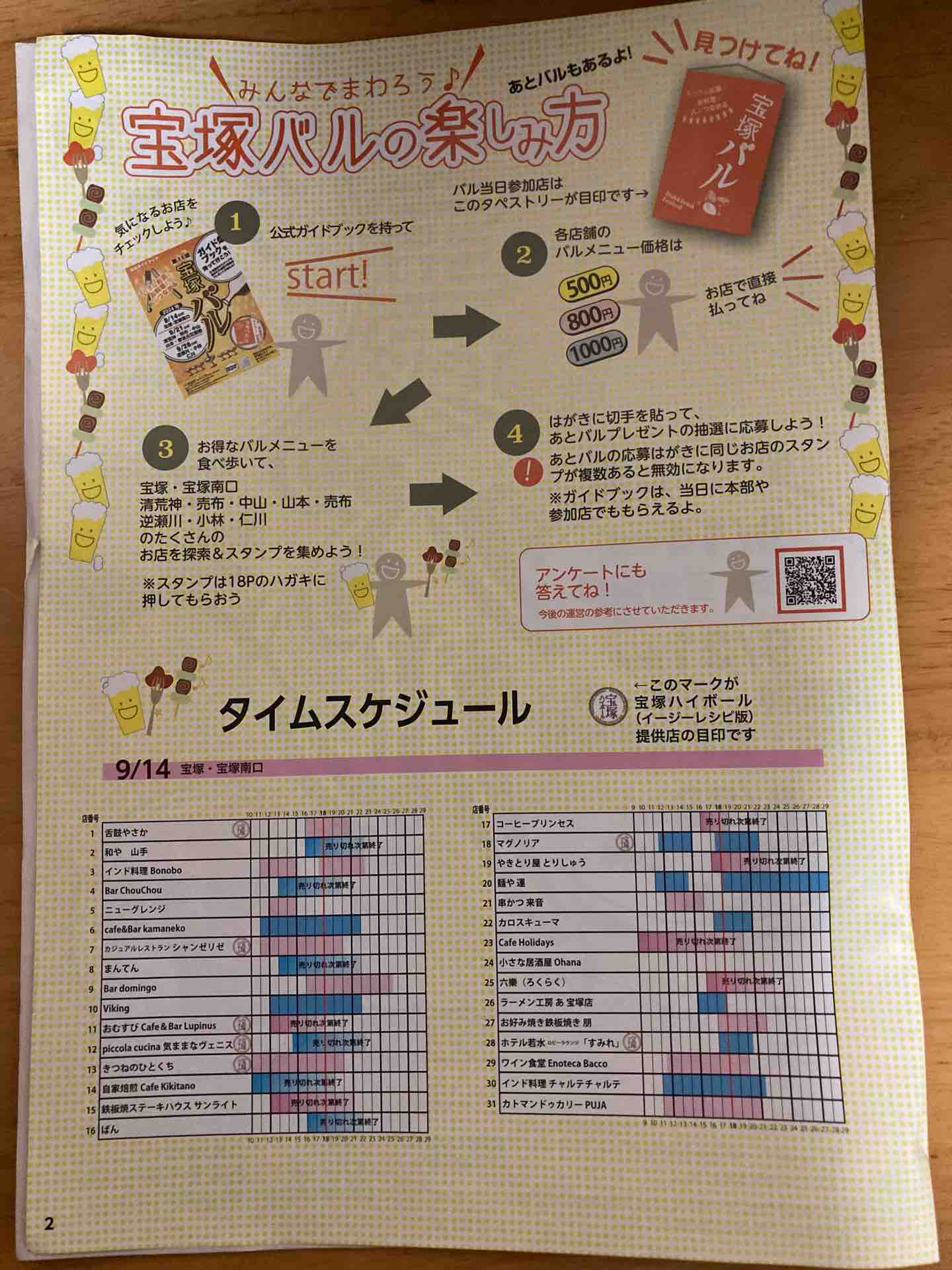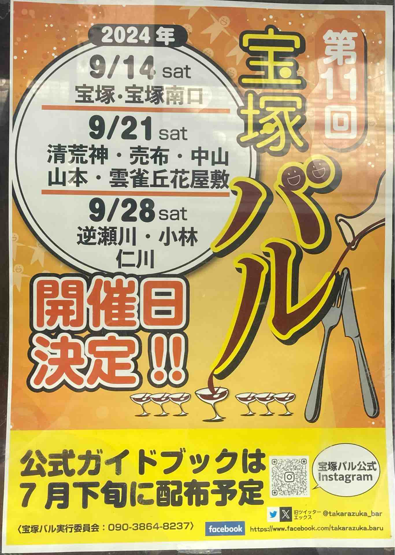 9/14、9/21の宝塚バルは終了しましたが、9/28は、逆瀬川・小林・仁川「宝塚バル」が開かれます。公式ガイドブックを入手できなかった人も、当時参加店に行けばバルメニューを注文することができるので、諦めずに行ってみてくださいね。