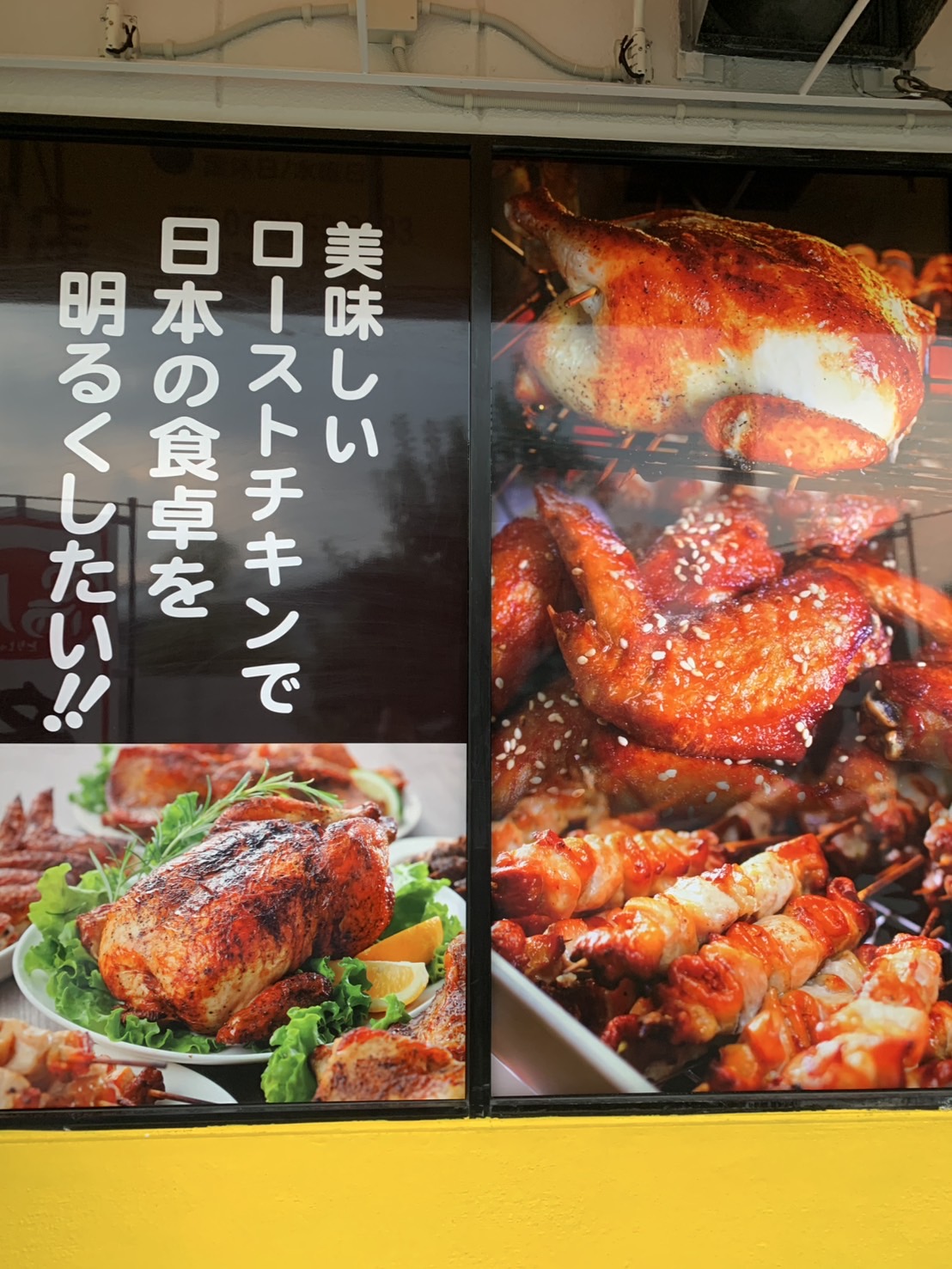 看板メニューの串焼ローストチキンは、回転式ロースターでじっくり焼き上げるのが特徴。