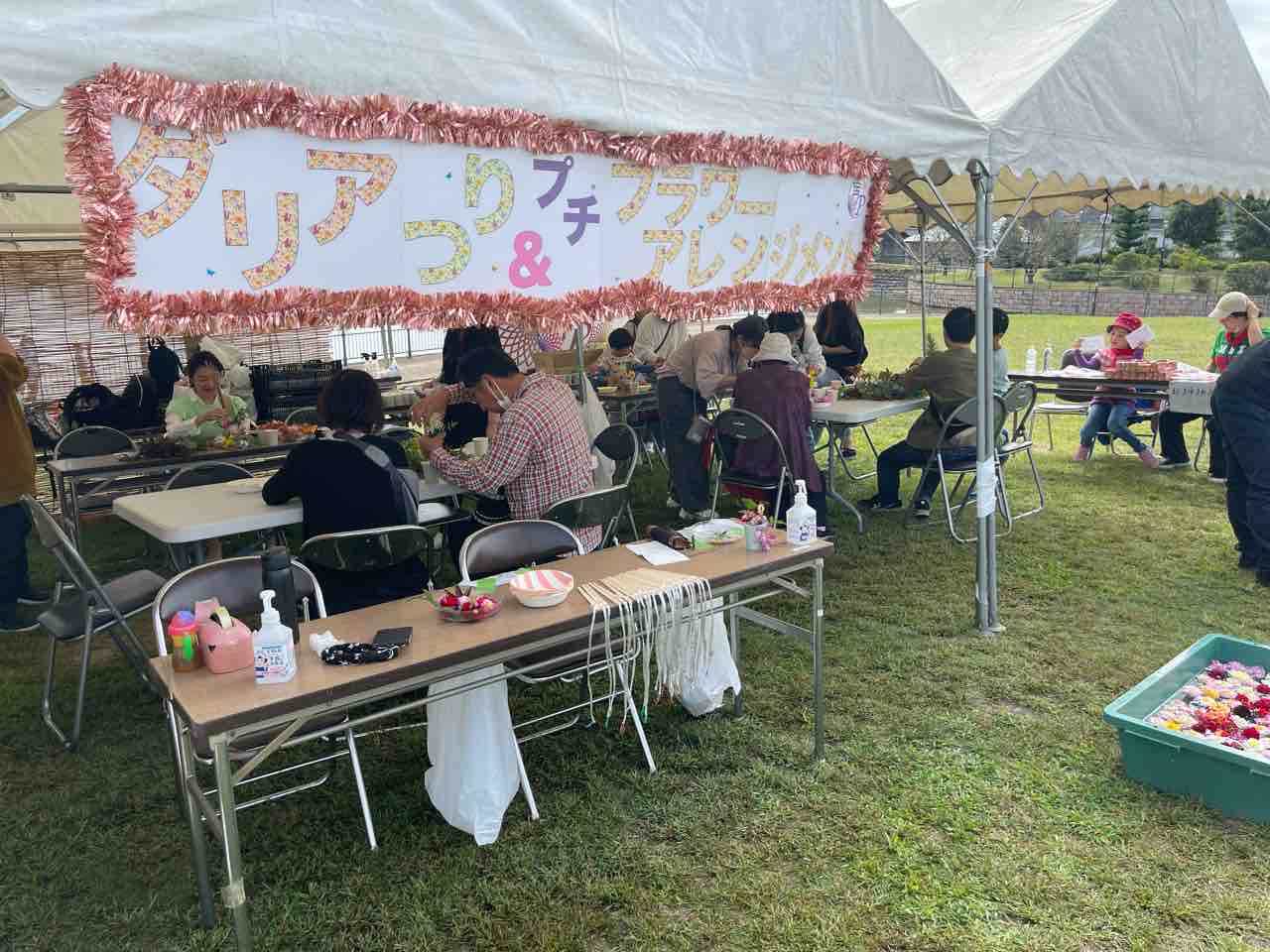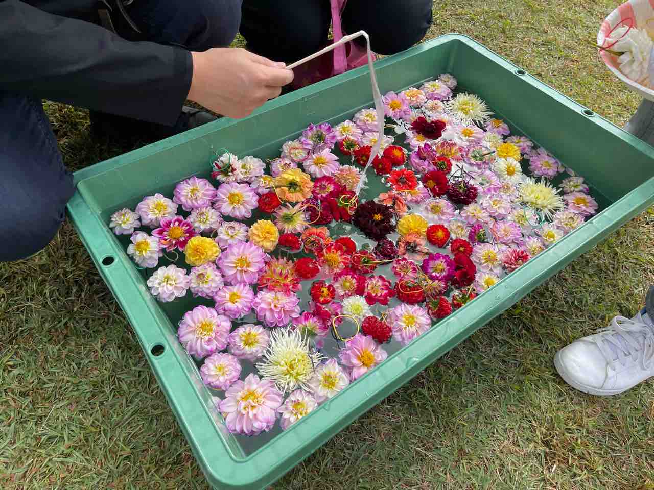 お姉さんが元気よく呼び込み、盛り上がっていたのがこちらのコーナー"ダリア釣り&プチフラワーアレンジメント"飛び込みでたくさんの方が参加しています。