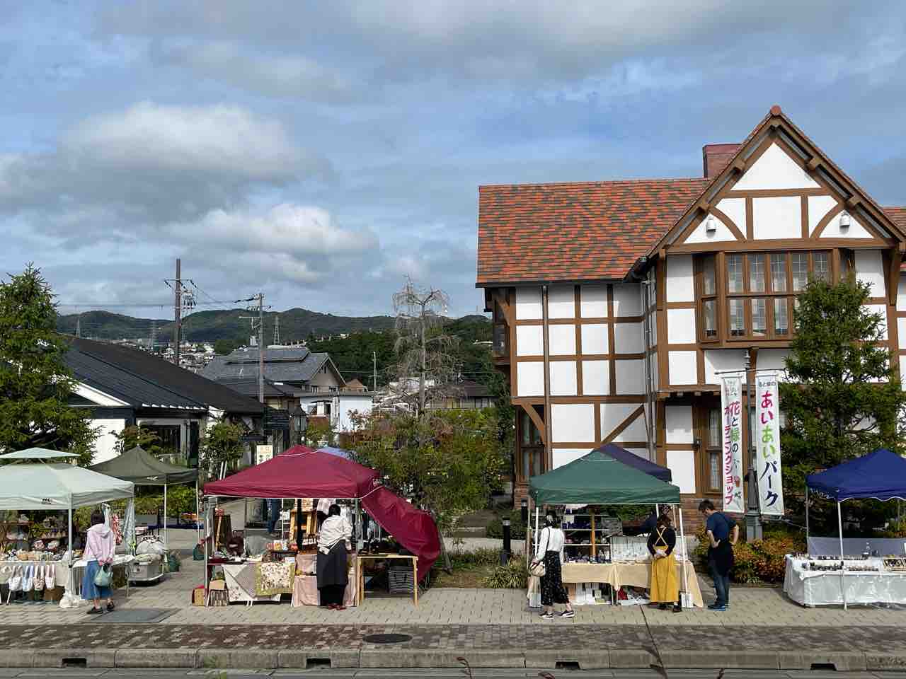 遠くからでもよく目立つ真っ赤なのぼりがはためき、その向こうにはあいあいパークの英国風の建物が。