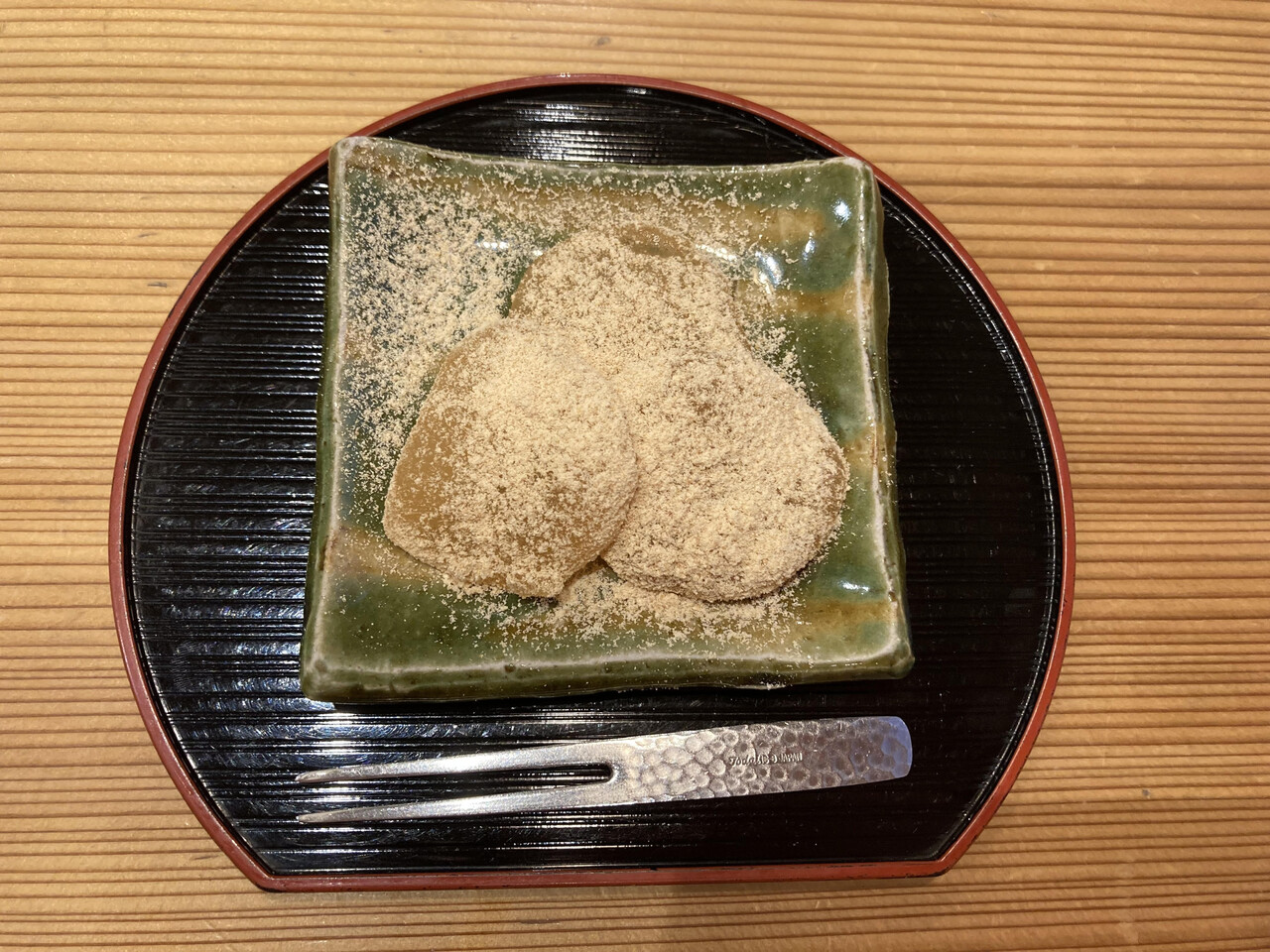 御前についているわらび餅。徳島県産の和三盆と北海道産黄な粉を使用した上品な甘さです。