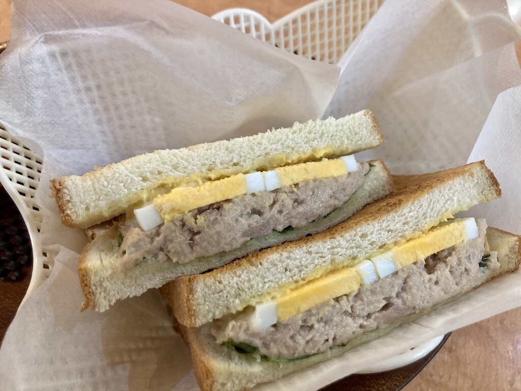 カウンターで注文後、席に着いて待っていると、カリカリにトーストしてもらったツナエッグサンドが到着。