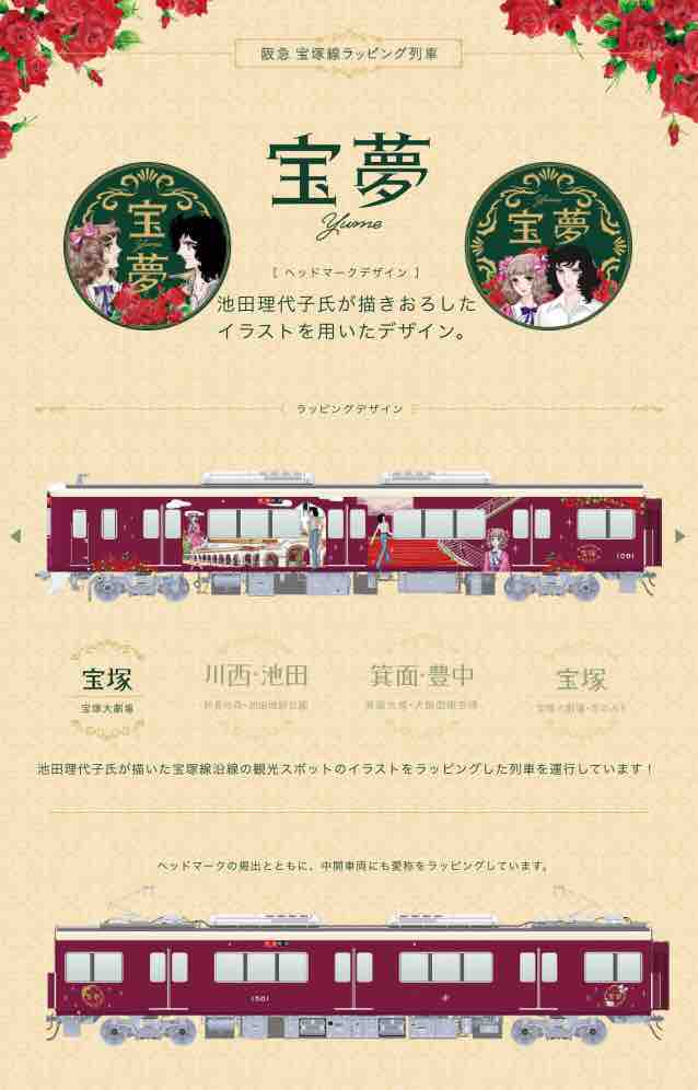 3月17日土曜日より阪急各線で新デザインのラッピング列車が運行している。宝塚線は、なんと「ベルばら」原作者の池田理代子氏の描きおろしたイラストデザイン。