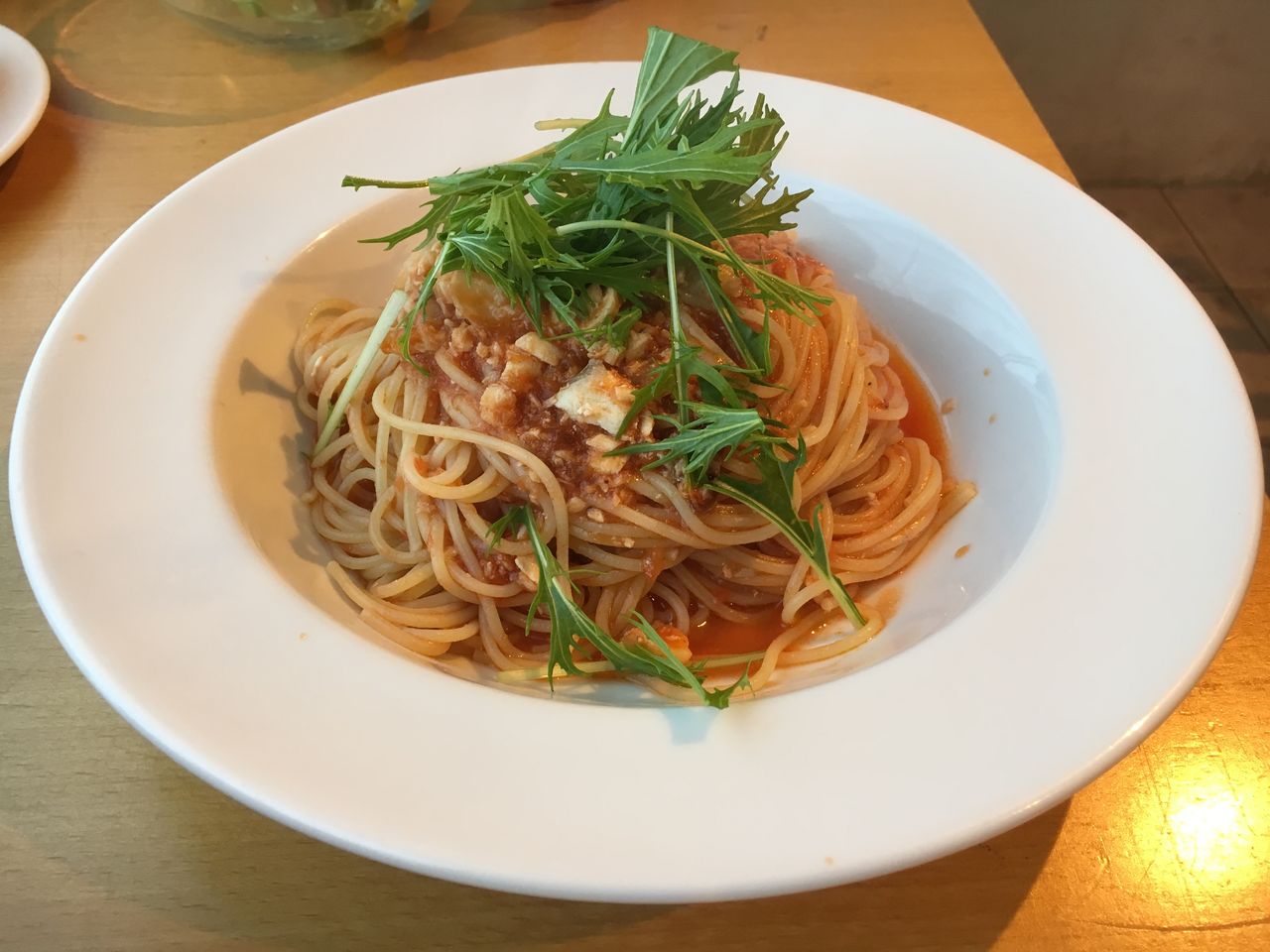 本日のパスタランチ「真鯛のトマトソースパスタ」。メインパスタにパンとサラダ、食後のドリンク(珈琲か紅茶)がついている。