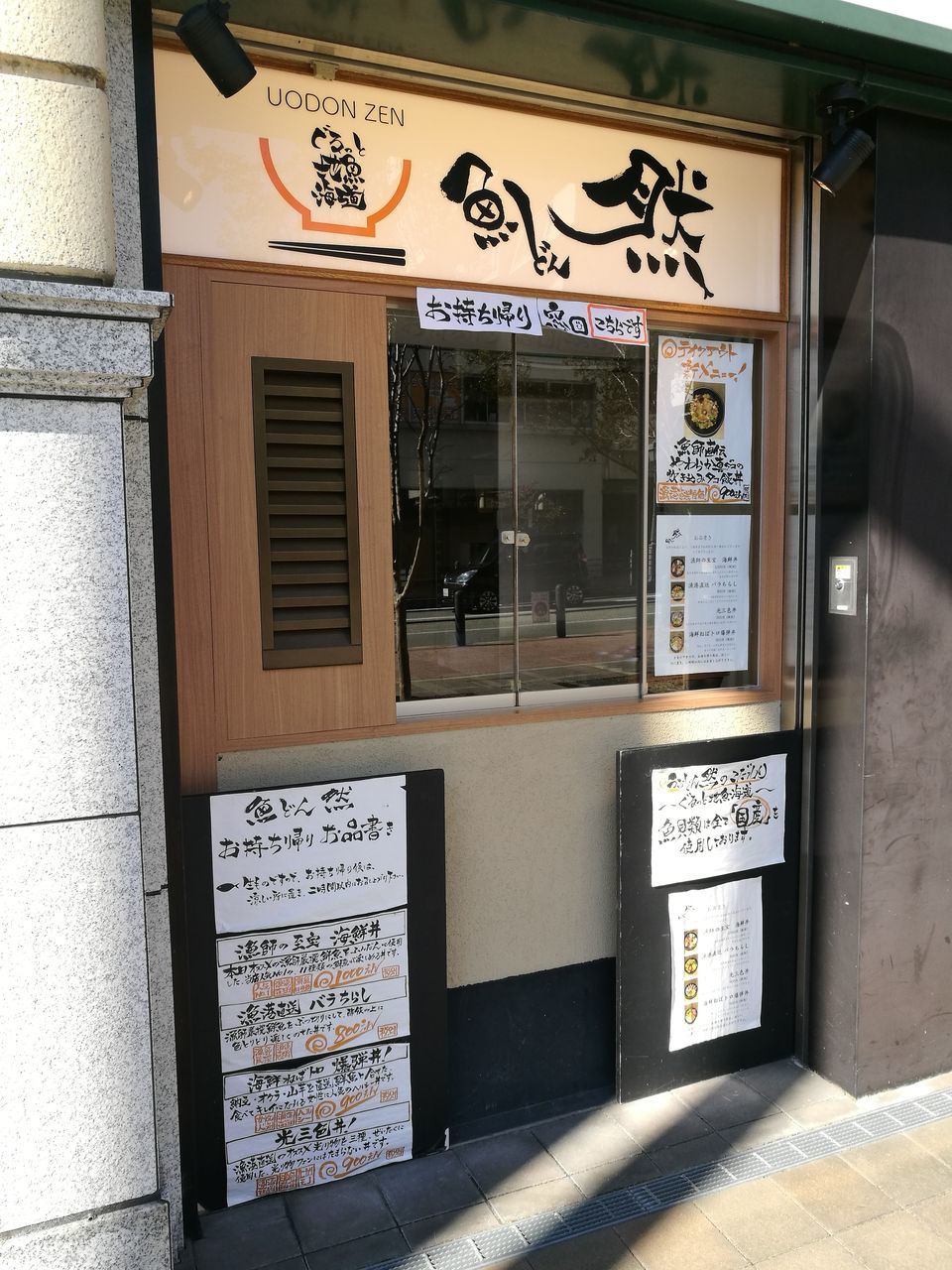 宝塚南口駅すぐのザ宝塚タワーの1階にある「魚どん 然」。以前このブログでも紹介させてもらっているし、ご存知の方もたくさんいるのではないでしょうか。筆者も訪れてみたいと思いつつ、行列ができていると聞いて足が遠のいていました。しかし先日、旧友と久しぶりに会って「魚どん 然」でランチをいただくことに。待ち合わせ時間よりほんの少し早く着いてしまったので、どんなメニューがあるのかなとうろうろしていると、「魚どん 然」の正面を右に曲がったところに”お持ち帰り窓口”を発見しました。
