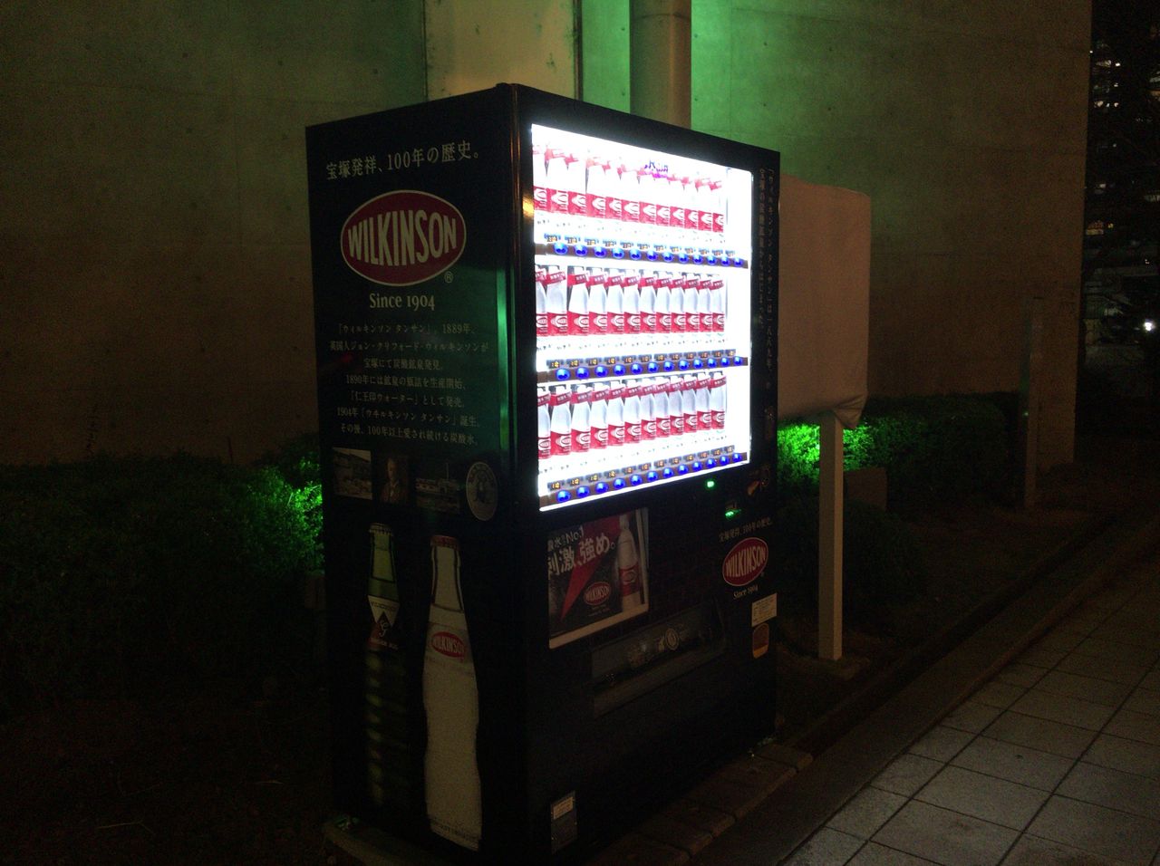 1週間程前に、ナチュールスパ宝塚の前に突如現れたウィルキンソンの自動販売機。自動販売機の機能としては、36種類の飲料を設置ができるモノでありがながら、全品ウィルキンソンタンサン一色。なかなかのインパクトで見栄えがする。