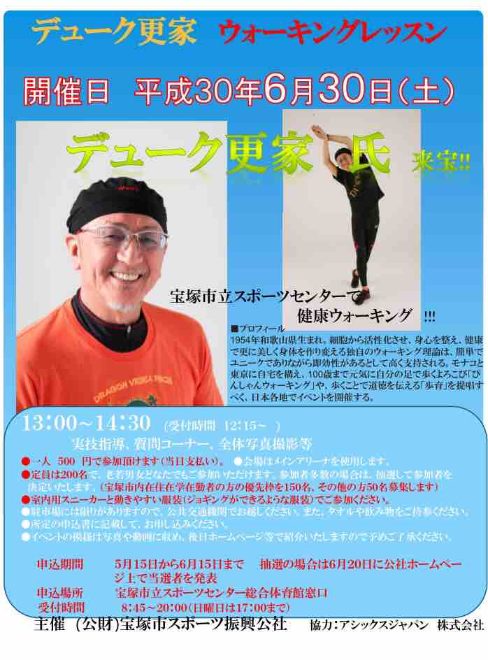 今回行われるウォーキングレッスンは、レッスンや公演で全国飛び回る”デューク更家氏”から直接指導を受けられる貴重な機会だ。
