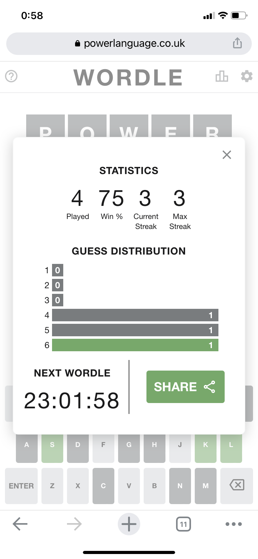 ちなみにこのwodle、1日1問限定なので、1問解くと、次の問題は翌日にならないと表示されない仕組みになっている。