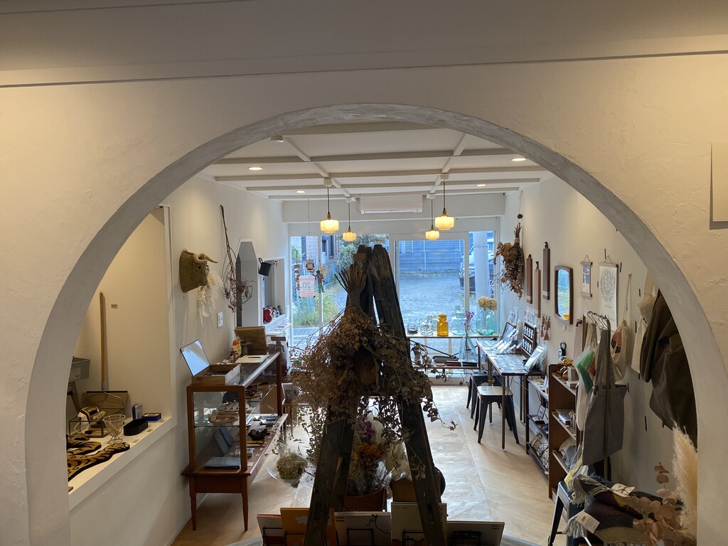アーチを仕切りにして店舗の手前に文房具や雑貨、奥に家具があります。