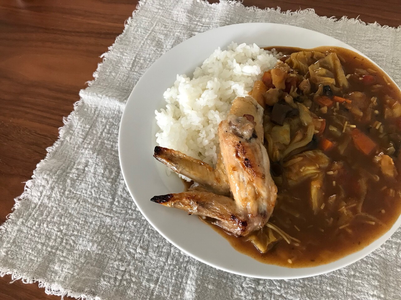 ご飯もルーもしっかりとした量がありました。ルーには人参やえのき、キャベツなど野菜がたくさん。スパイスカレーですが辛さはなく、さっぱりとした中にもしっかりスパイスの旨味が感じられました。手羽先との相性も抜群で、どんどん食べ進めてしまいます。