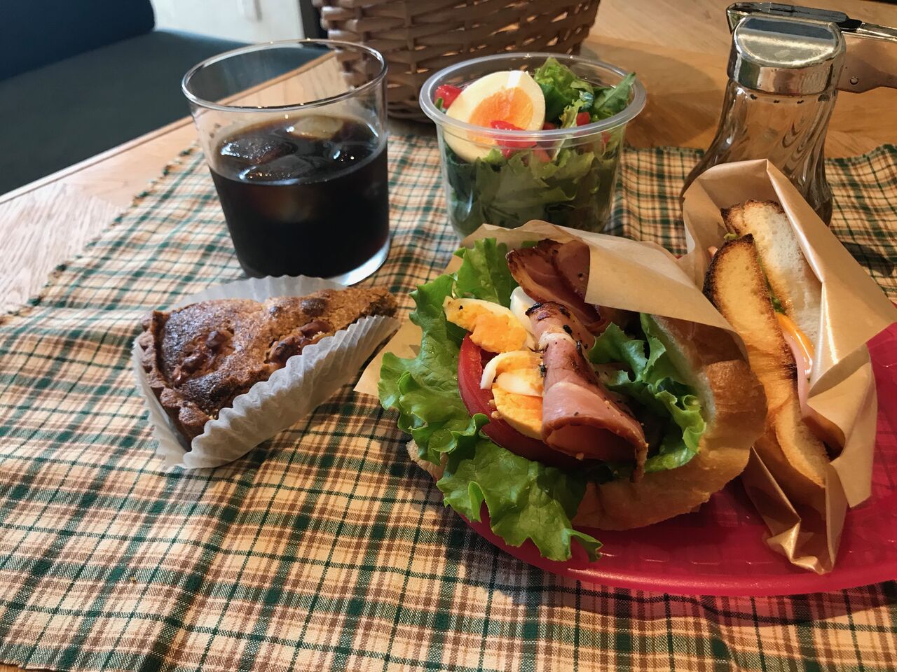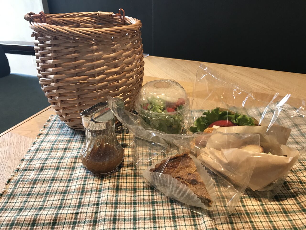この日のメニューはBLTサンドイッチ、ハムとチーズのベーグルサンド、野菜サラダ、無花果と紅茶のタルトでした。