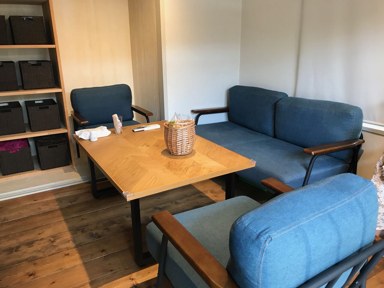 階段を昇ったところで靴を脱ぎ、靴箱へ。 はなれの中はフローリングの床にソファとテーブルが置かれています。