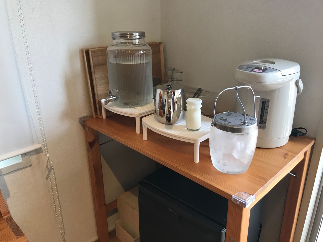 入ってすぐ右手側にホットコーヒー、冷蔵庫にアイスコーヒー、紅茶のティーパックとポットが用意されていて、飲み物はあるだけ自由に飲めるようになっています。