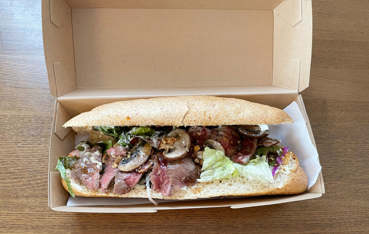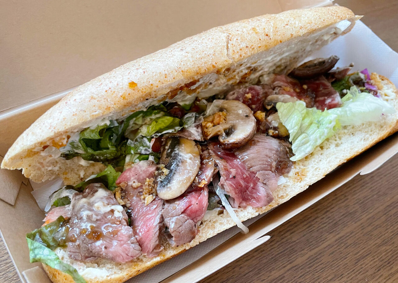 ステーキサンドにはヘルシーな小麦胚芽パンが使われており、