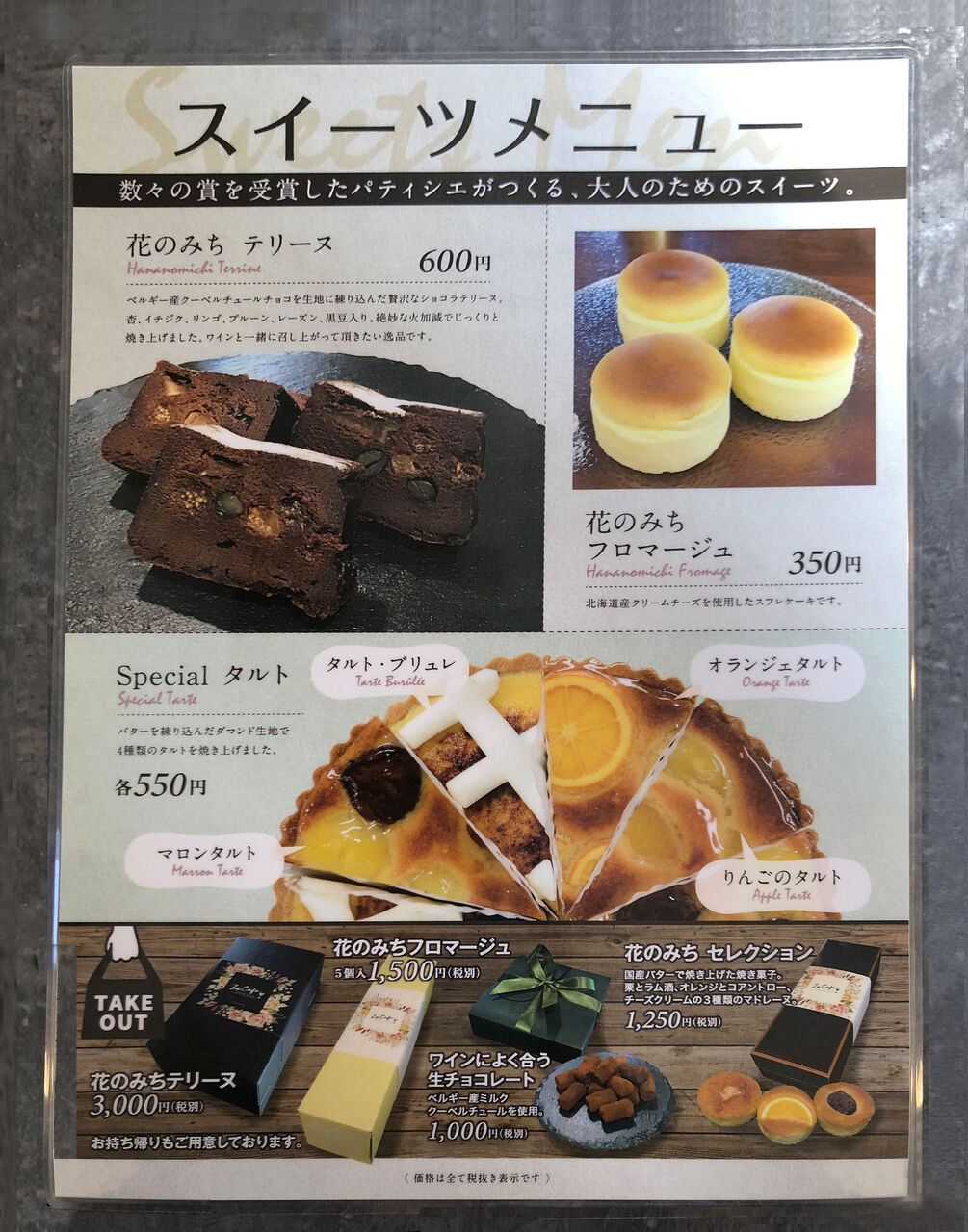 ワインによく合う生チョコレートや花のみちテリーヌは、おみやげなどにもいいですね。