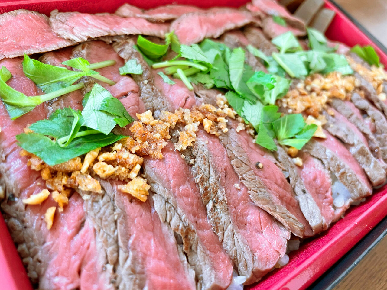 今回は、国産牛100%のヘルシーな赤身肉をしっとりミディアムレアに焼きあげた国産牛ステーキ重と、同じく国産牛ステーキを贅沢にもサンドウィッチにたっぷり使った花のみちステーキサンドをチョイスしました。