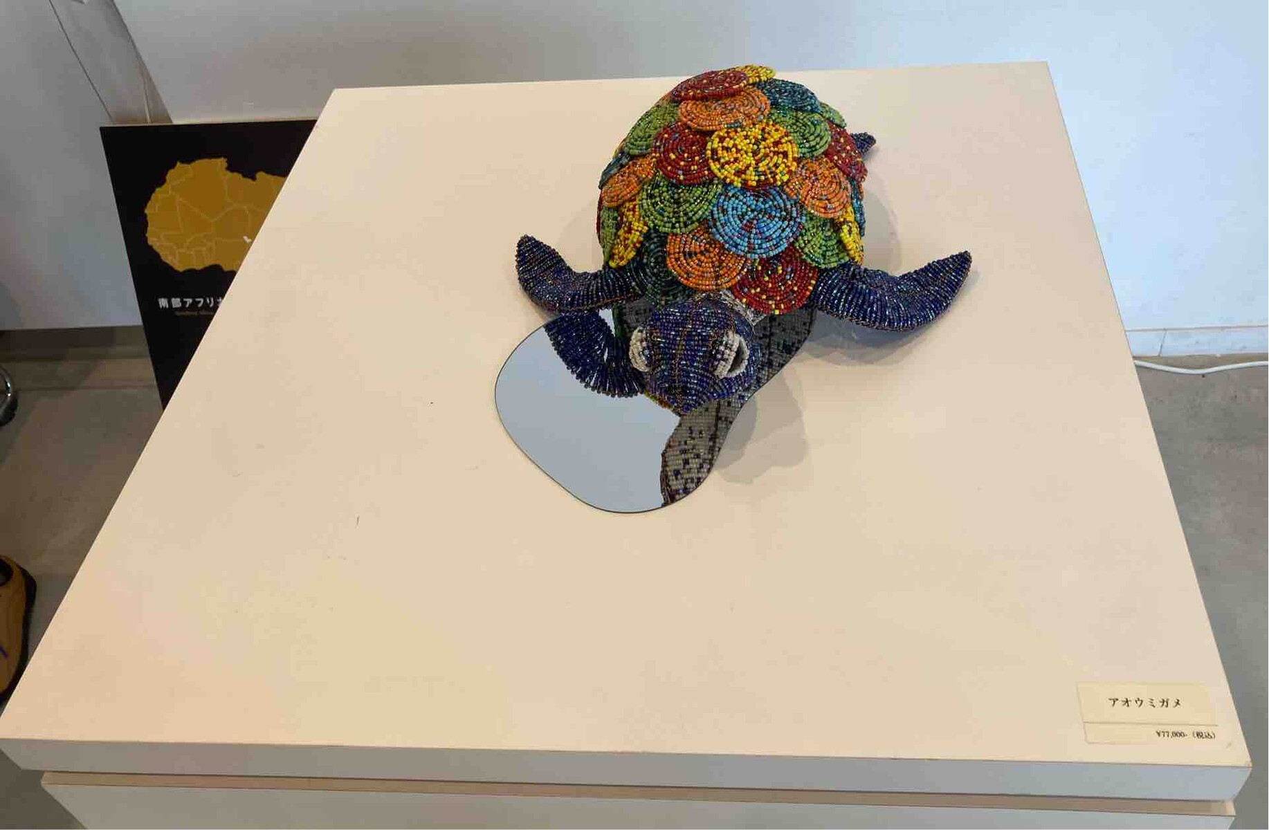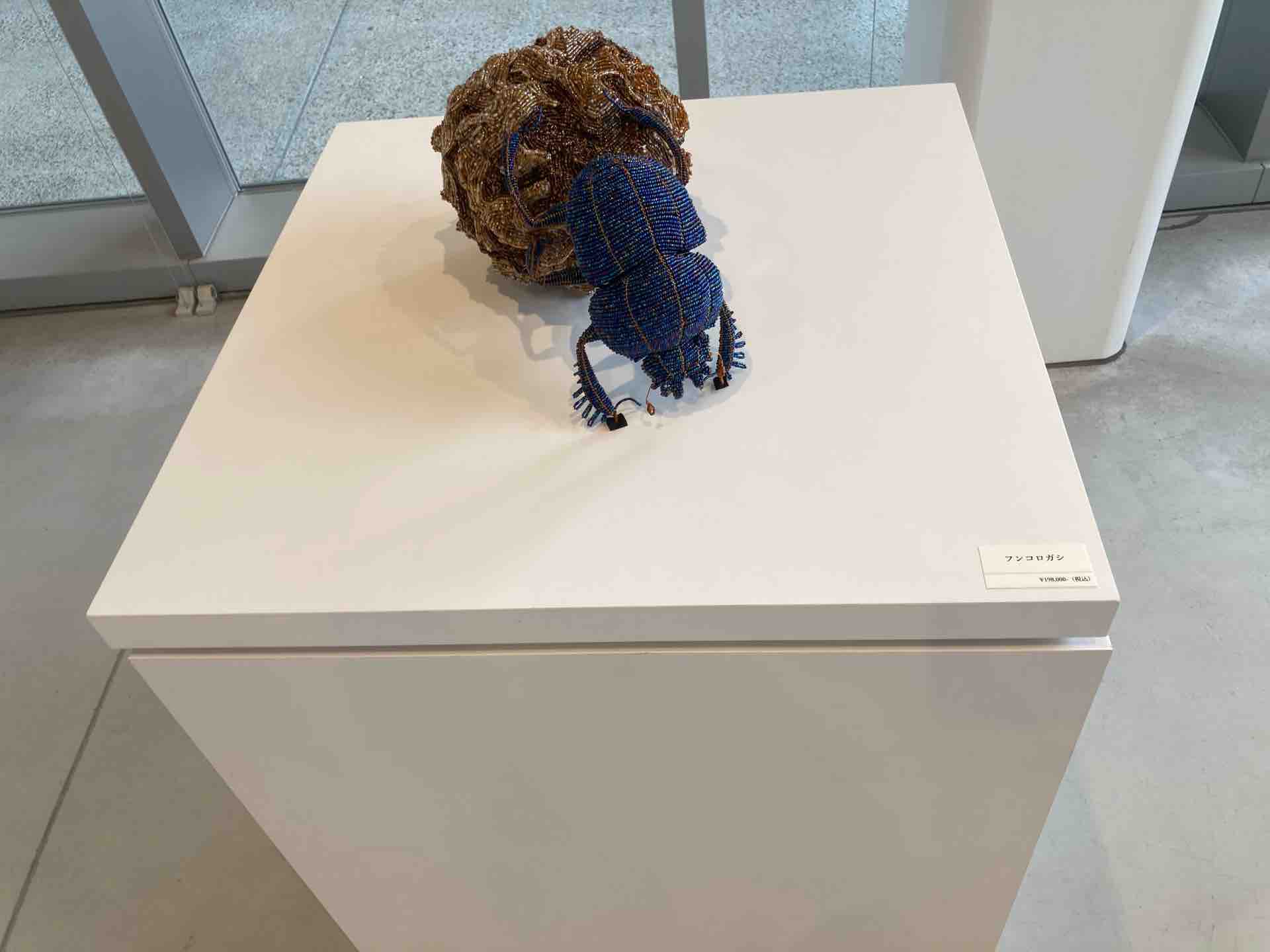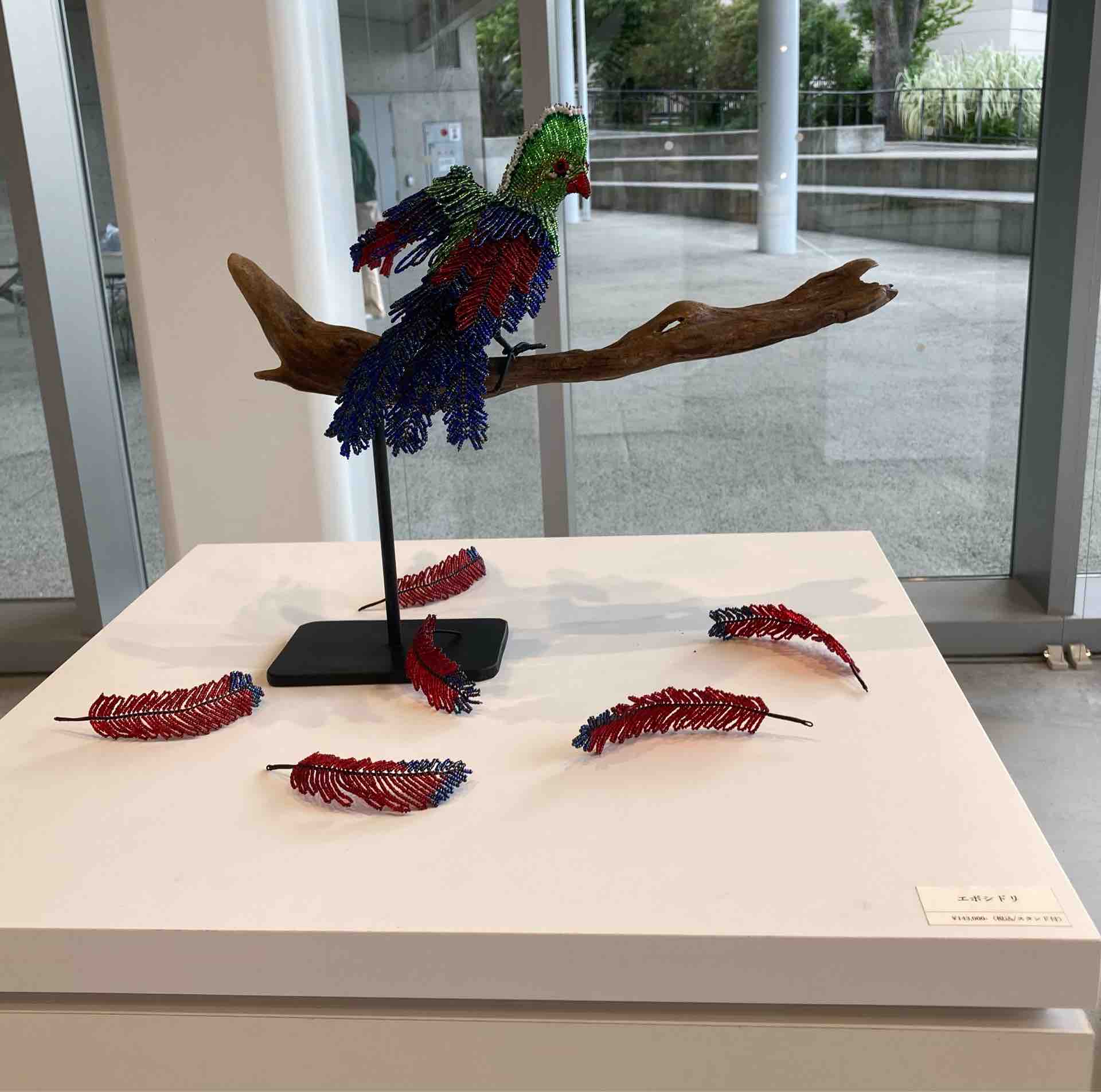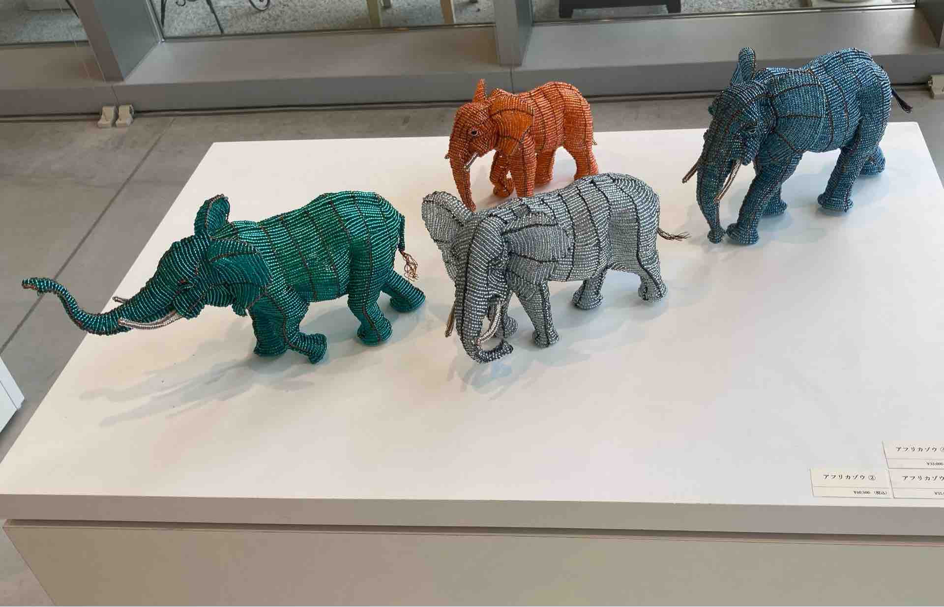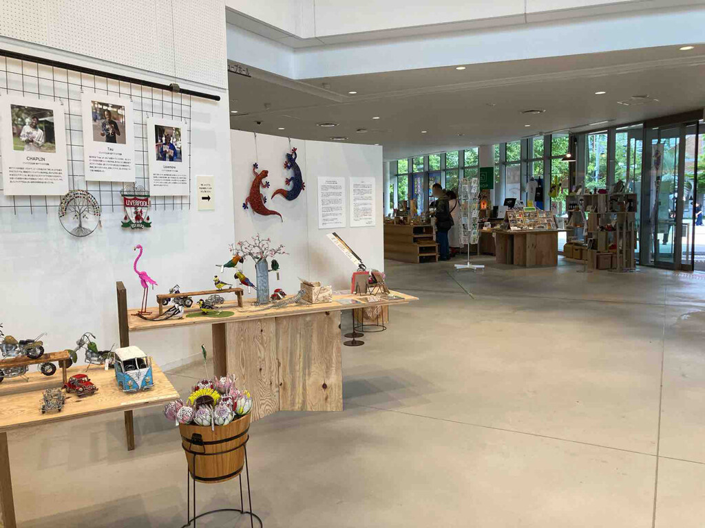 センター入り口近くのショップで常時販売されています。カラフルでワイルドなアフリカの動物をモチーフにした作品は、見ているだけで元気がもらえますね。可愛いキーホルダーはお求めやすい手頃なお値段でおすすめですよ。今回の展覧会の最終日にはキューブホールの展示室がすっきりと感じられるほど、作品がよく売れていました。ショップスタッフの浅井さんによれば、ZUVALANGA展会期中はショップでもZUVALANGA作品が大人気で、売り切れになってしまった作品もあるそうです。展覧会を見逃してしまった人も、展覧会を観た人も、ショップでZUVALANGA展の余韻に浸りながら、ポップで華やかなビーズアートを選んで見てはいかがでしょうか。