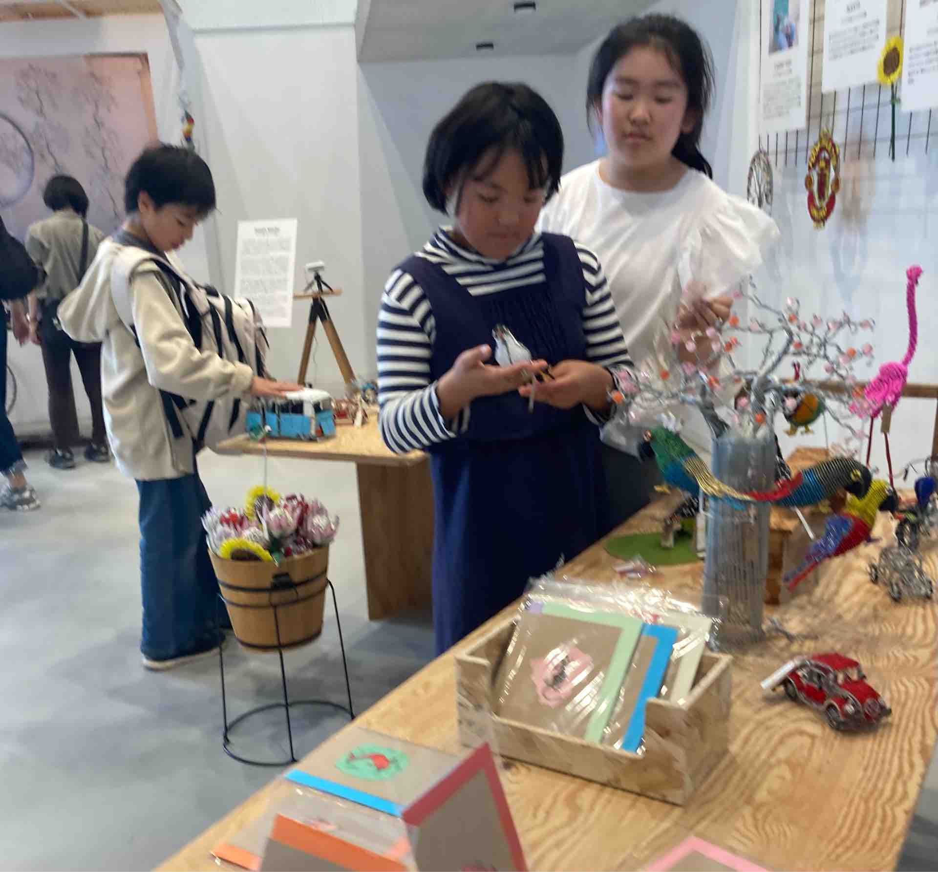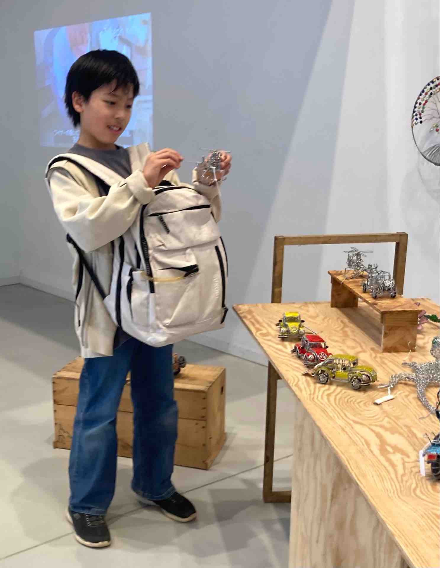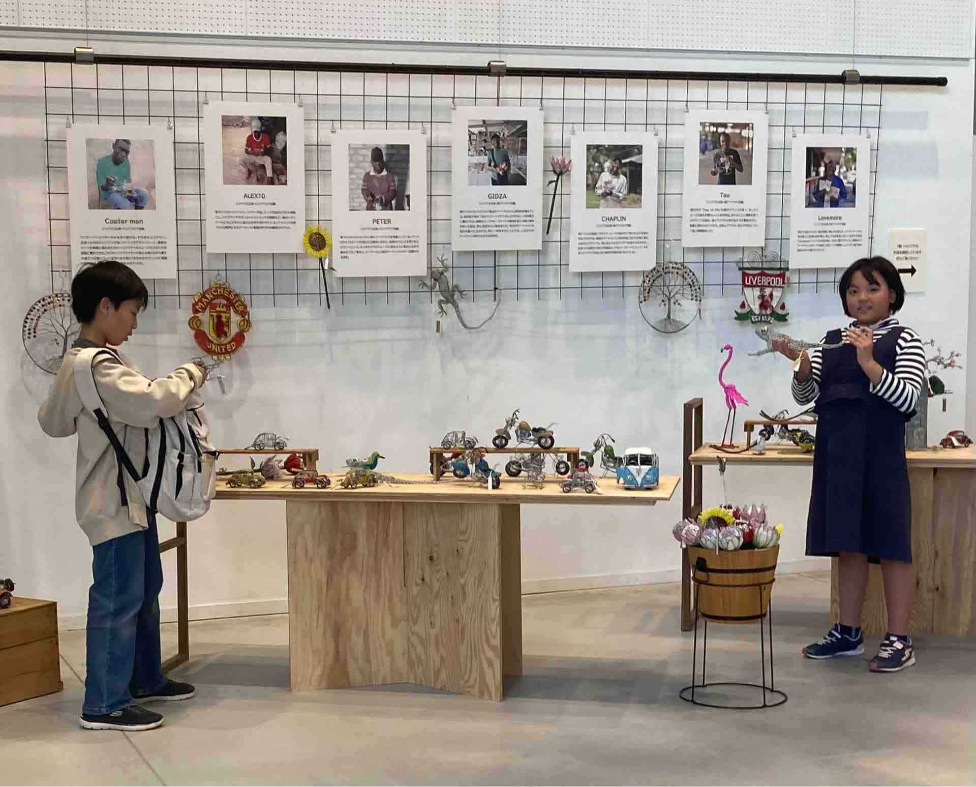 ジョセフさんのアーティスト仲間のプロフィールと写真も展示されていました。プロフィールキャプションの下のテーブルに展示されているのは彼らの作品です。子どもたちは作品を手に取り、早速遊んでいました。