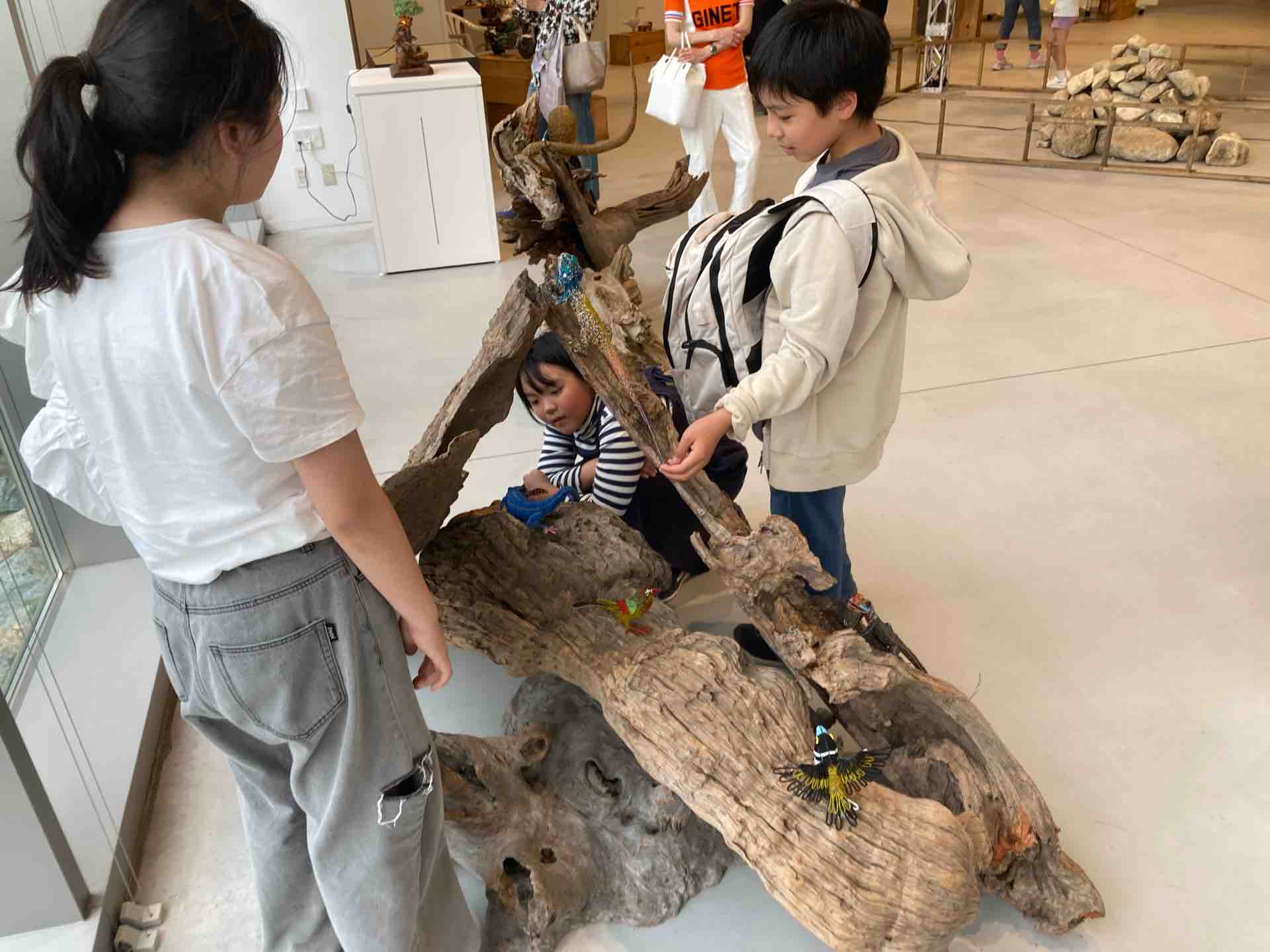 「アカエリマキキツネザル」と「ハシビロコウ」。レアな人気者「ハシビロコウ」を形作った作品に会えて、子どもたちも大喜び。