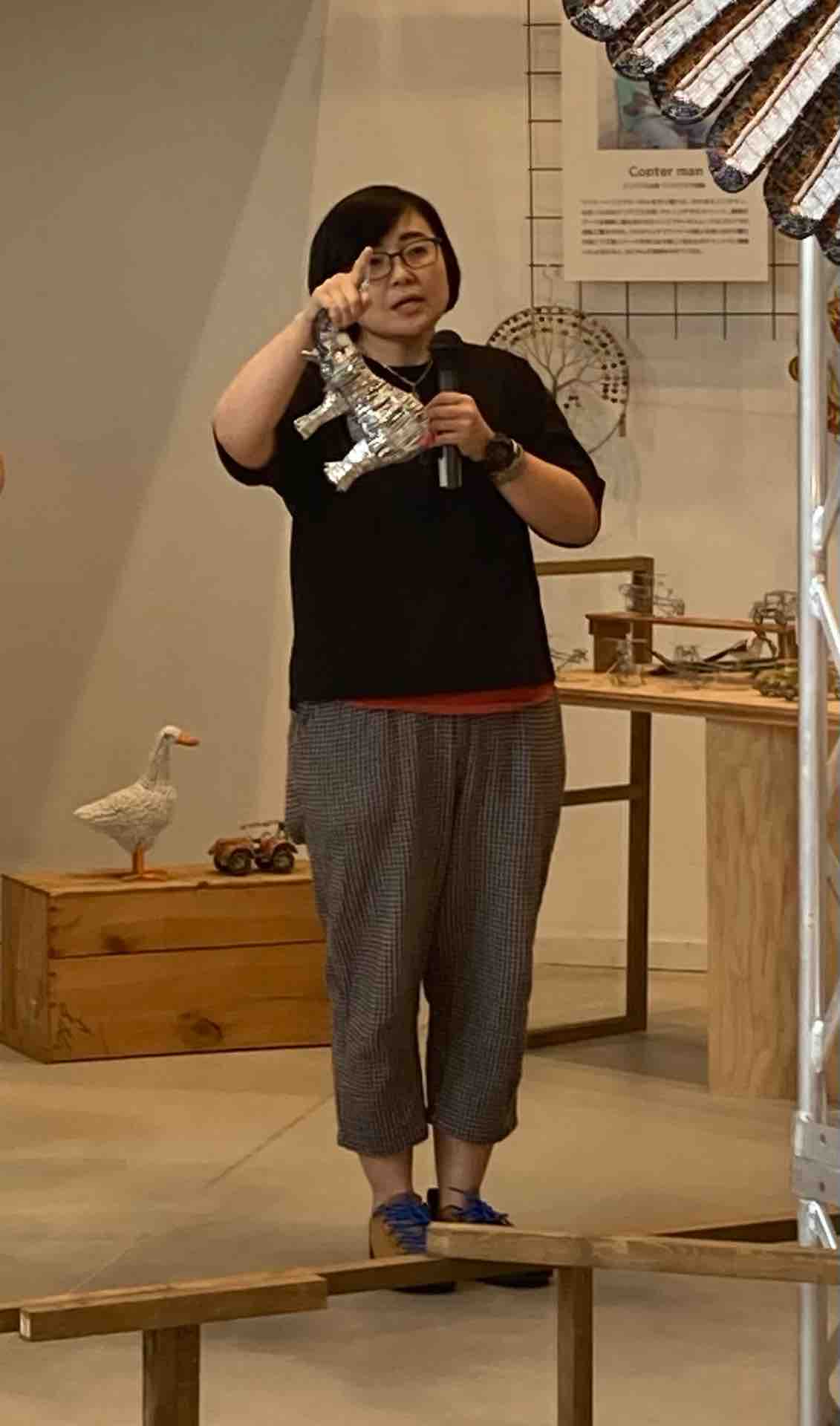 おもちゃがない子どもたちのためにお父さんたちがおもちゃを手作りしたことから始まった、ジンバブエ発祥のワイヤー&ビーズアートについて紹介する北窓さん。